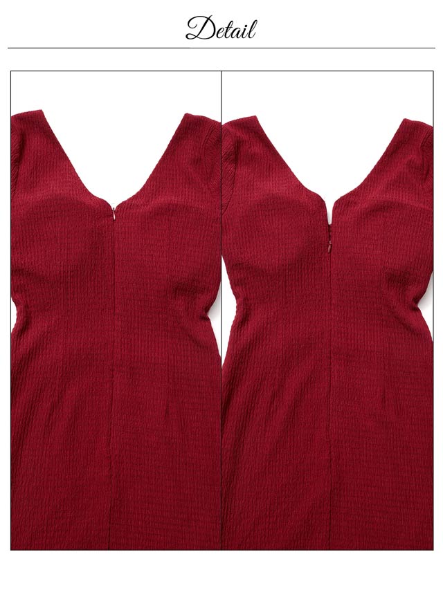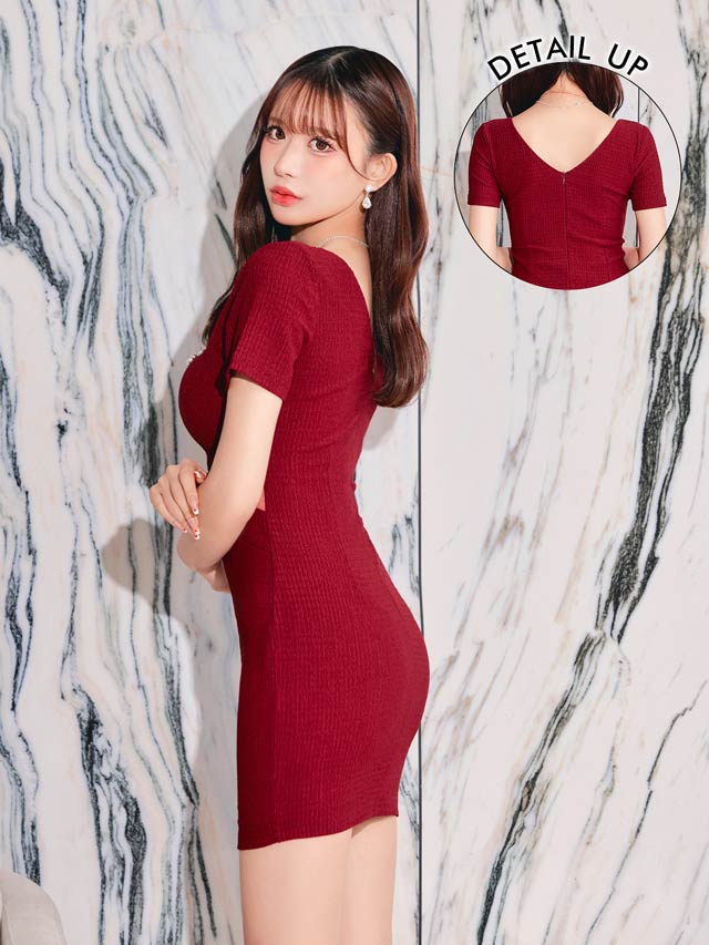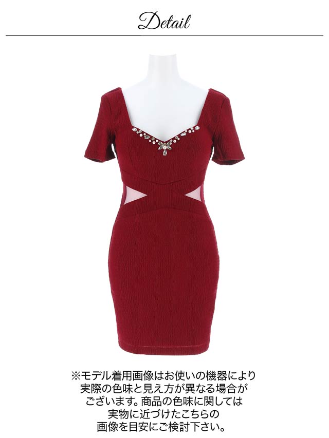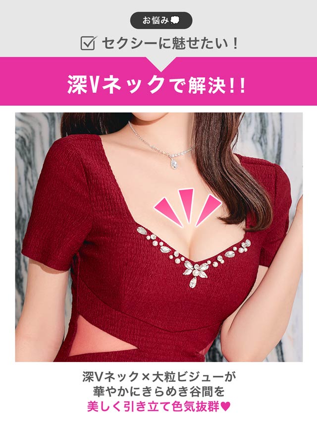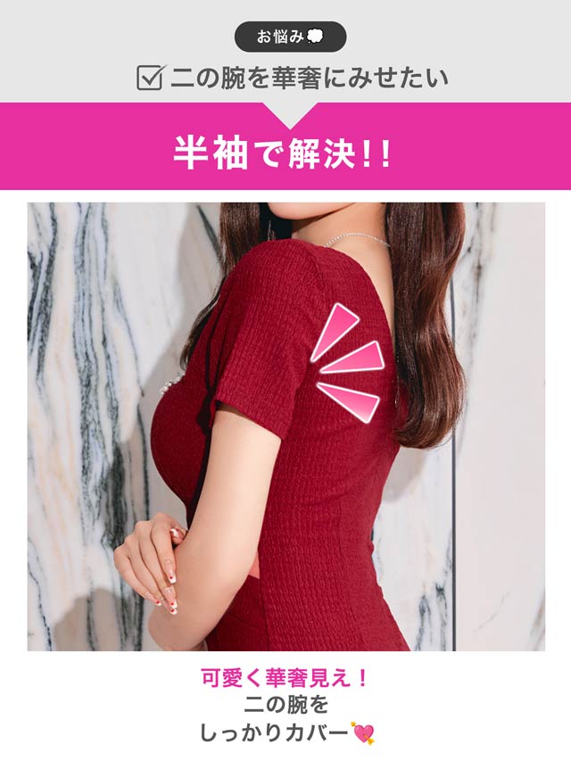 バスト部分にあしらった大粒ビジューが華やかにきらめき、谷間を美しく引き立てるキャバドレス。ウエストのカットデザインがくびれを強調し、自然な細見え効果を叶えます♪半袖仕様なので二の腕を隠したい方にもぴったりです◎