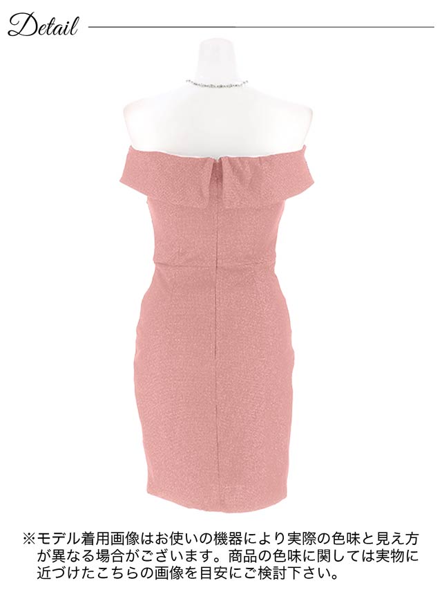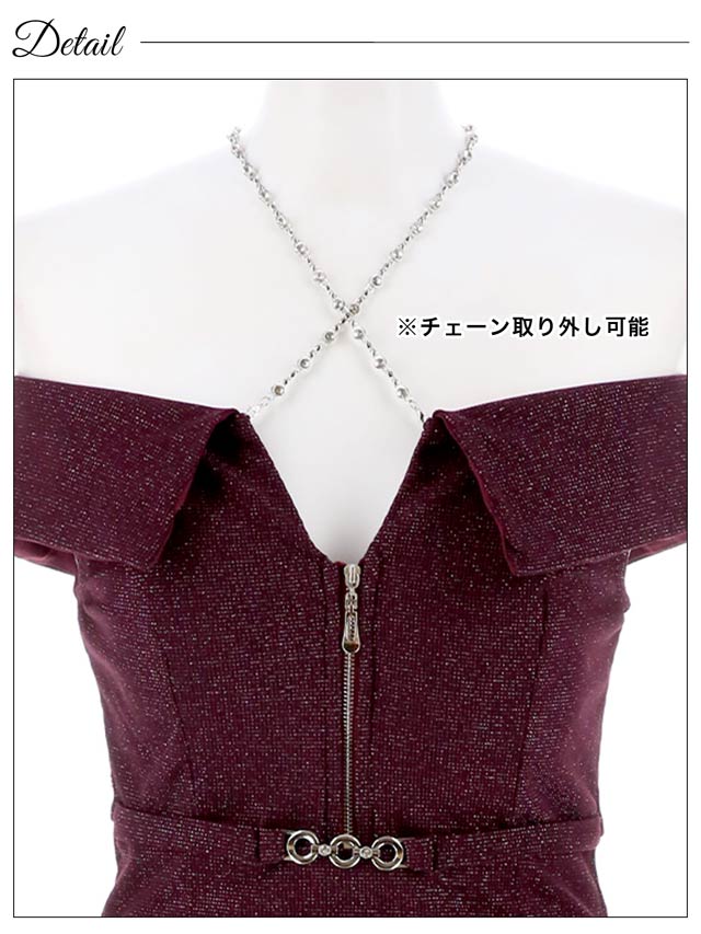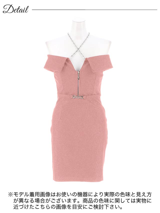 キラリと輝くラメ生地にビジューのホルターネックが華やかなミニドレス。人気のフロントジップやベルトモチーフを加え女性らしい曲線美もしっかりアピール♪ 大胆なオフショル仕様で肩から胸元までしっかり肌魅せ出来る1着です。