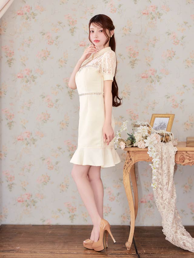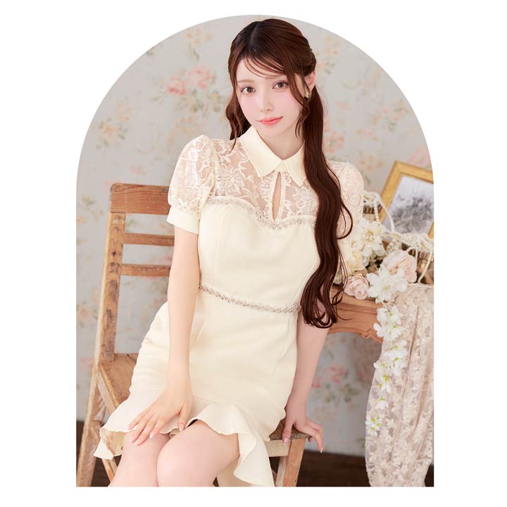 高級感漂うツイード生地と女性らしいフラワーレースを合わせたミニドレス。胸元は透け×ちら見せで男性心をくすぐるデザインに。デコルテやウエスト部分にあしらわれたビジューが上品な輝きを放ちます◎女性らしい曲線美と、脚長効果デザインなのでスタイル良く見えてオススメ! 透けレースの色っぽさの中にも、凛とした美しさが漂う1着です♪