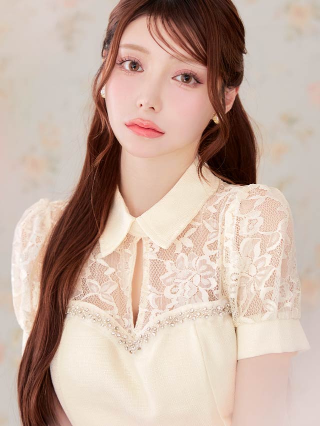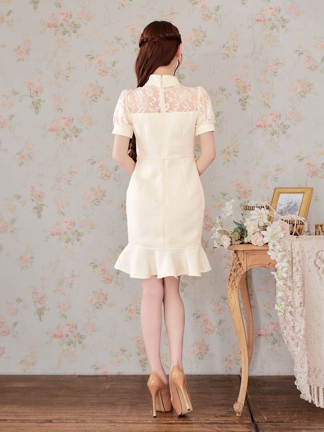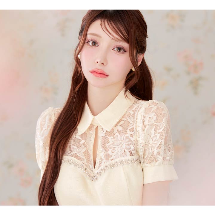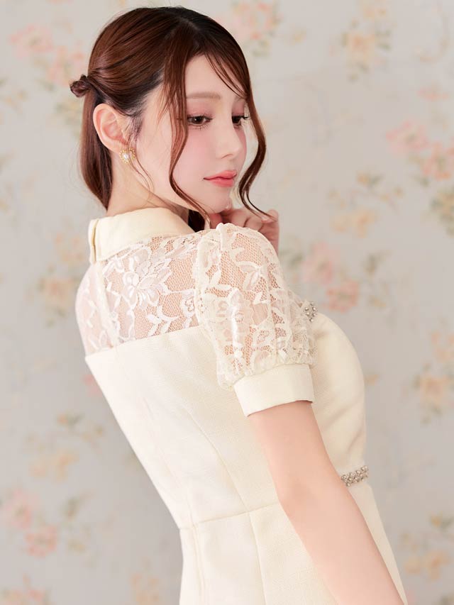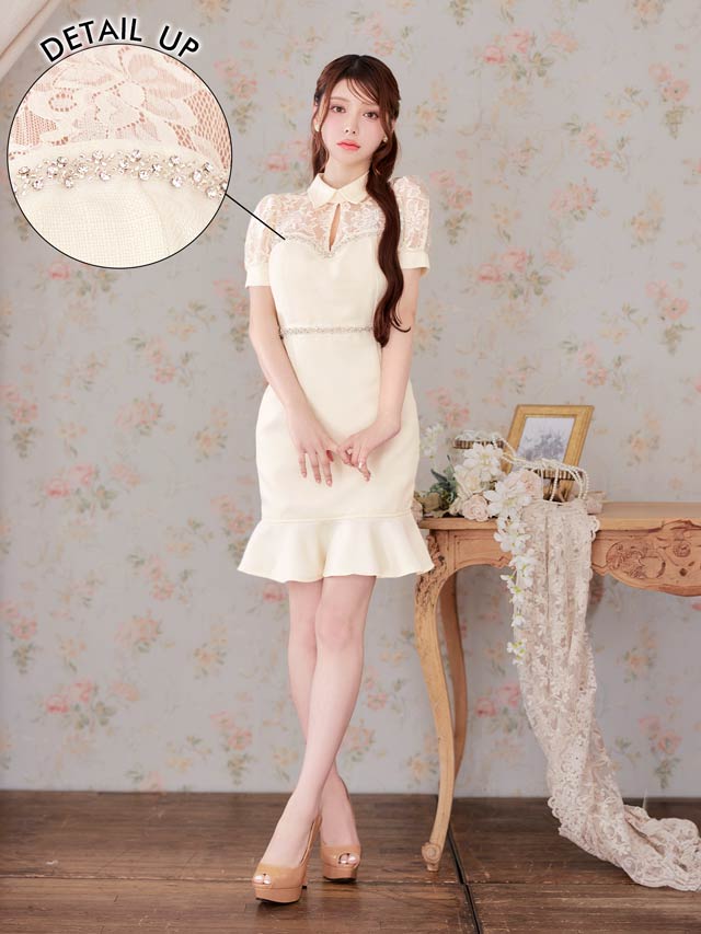 襟付きサマーツイードビジューレースパフスリーブマーメイドミニドレス[SML/3サイズ展開]