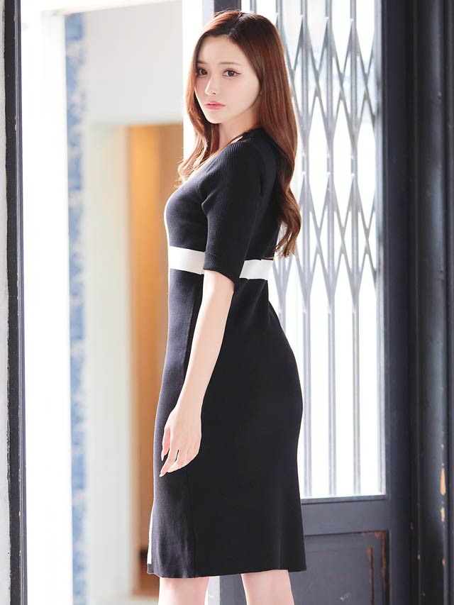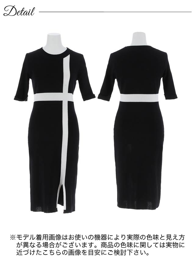 ハイウエストとサイドの幅広ラインがシルエットにメリハリを付けてくれるニットワンピース。膝丈スカートのスリットから覗く太腿が魅惑的♪ 半袖仕様なので腕周りの体型カバーにもなる着回し万能なアイテムです。
