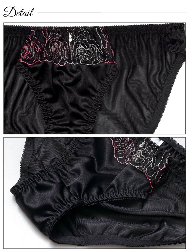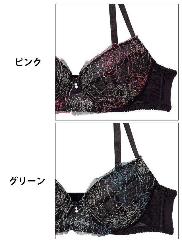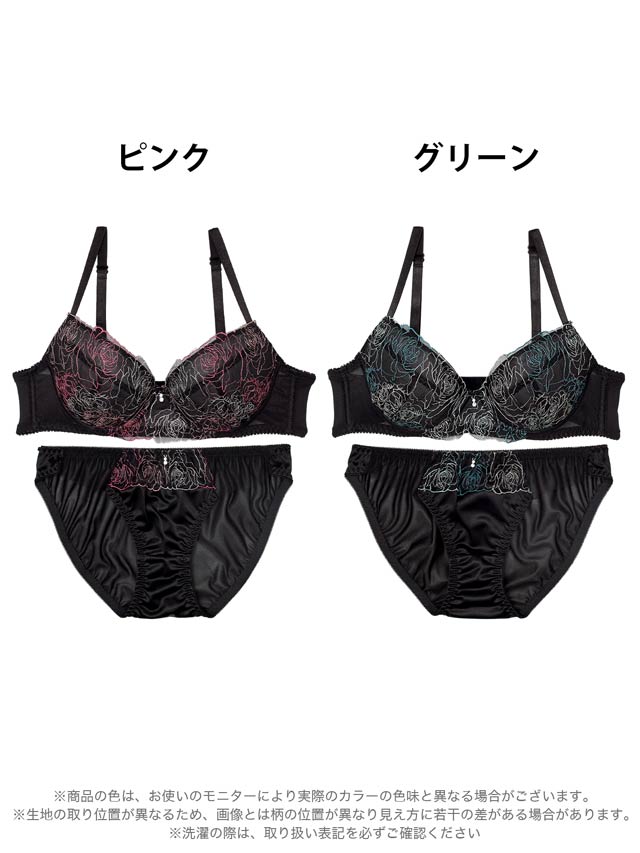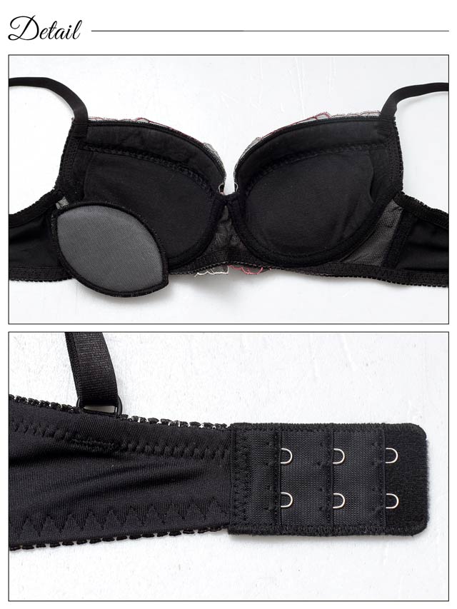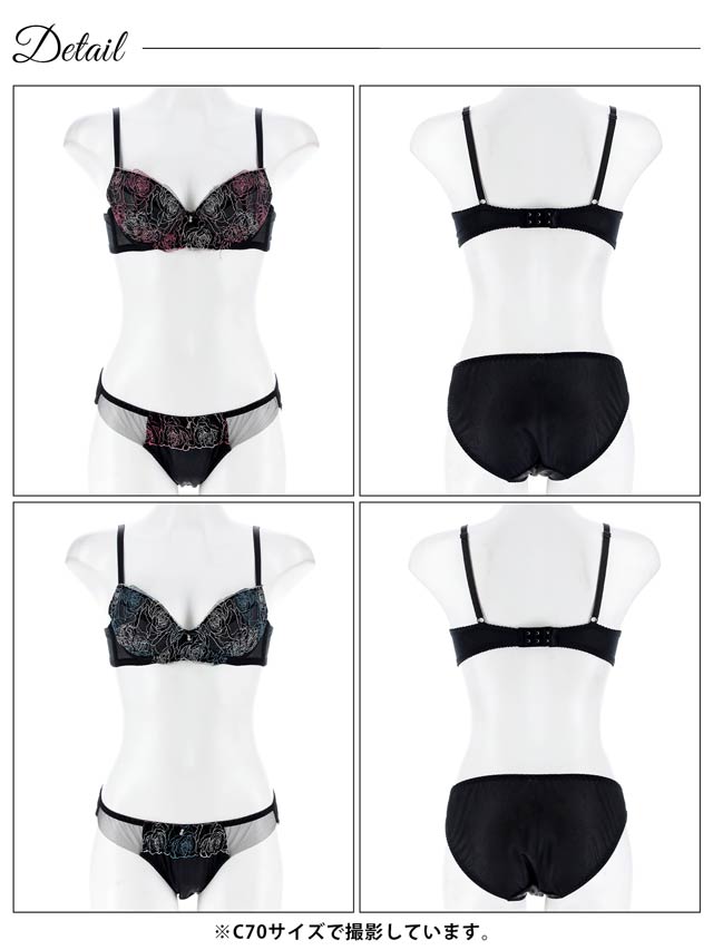 繊細に描かれたバイカラーのローズ刺繍が浮かび上がるシックな雰囲気のランジェリー。取り外し可能な付属パッド入りなのでお好みでバストのボリューム調整ができます◎ショーツフロントのほんのりセクシーな透け感もポイントになった1着です♪