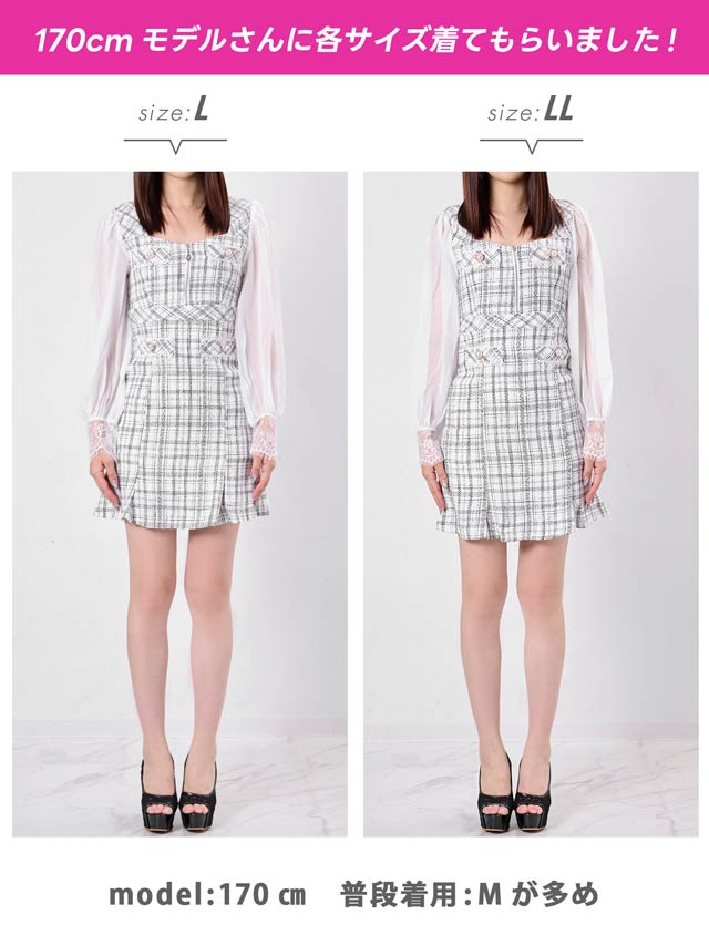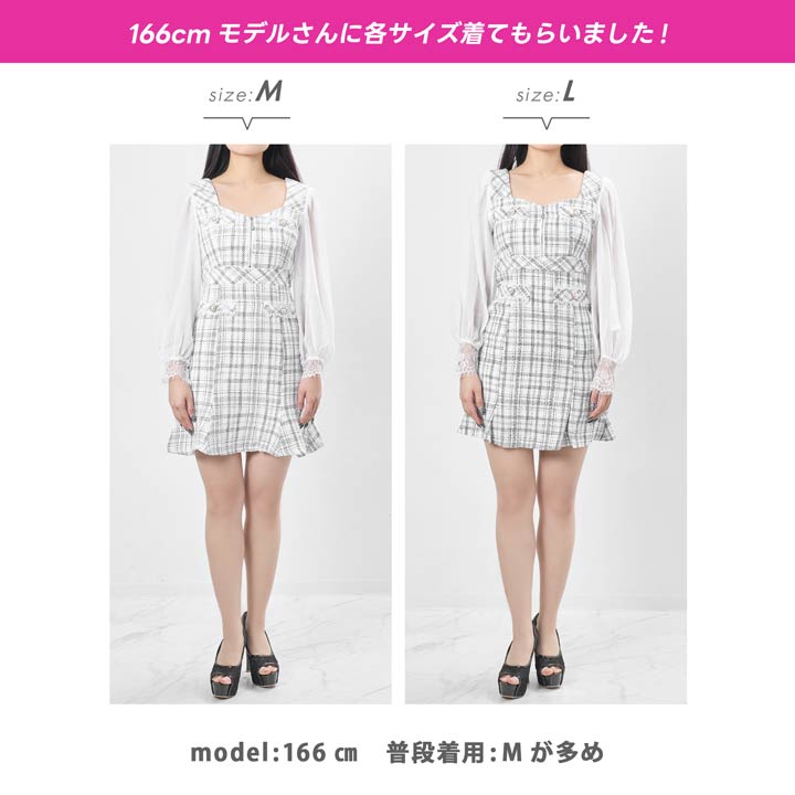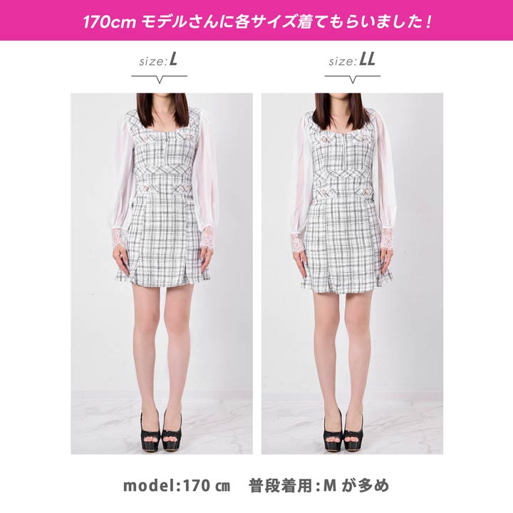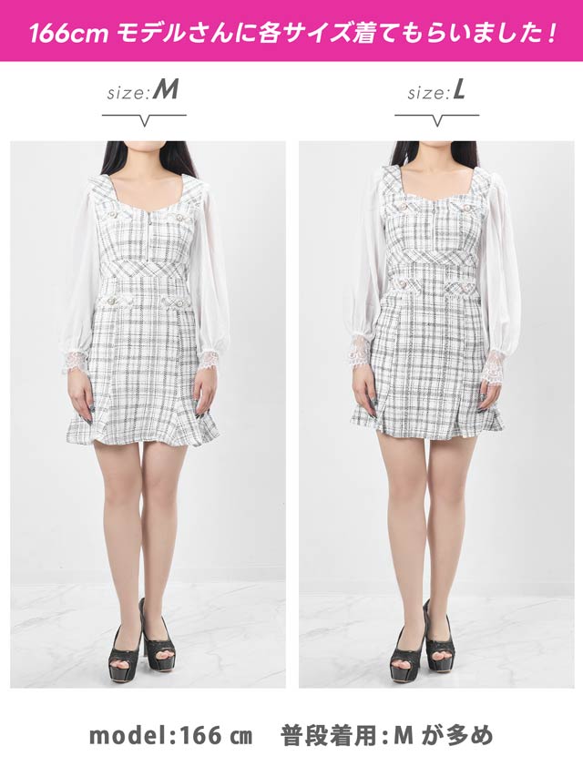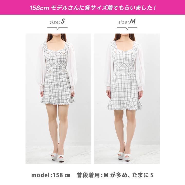 チェック柄×パールビジューでキレイめカジュアルな印象のマーメイドミニドレス。フロントジップ仕様で谷間の開き具合が調整可能です◎ シフォンスリーブでやわらかい印象を与えるとともに、二の腕カバーも出来る1着です。
