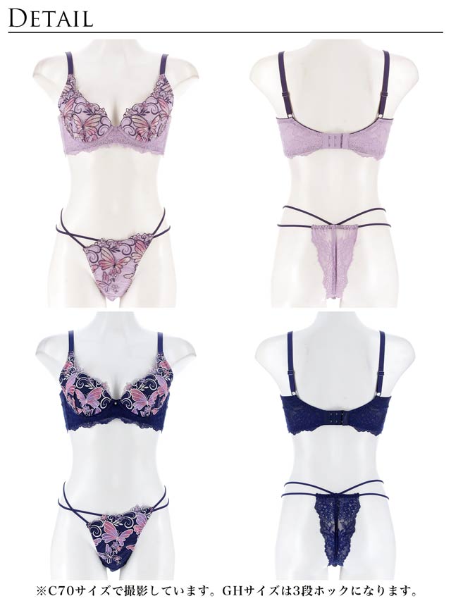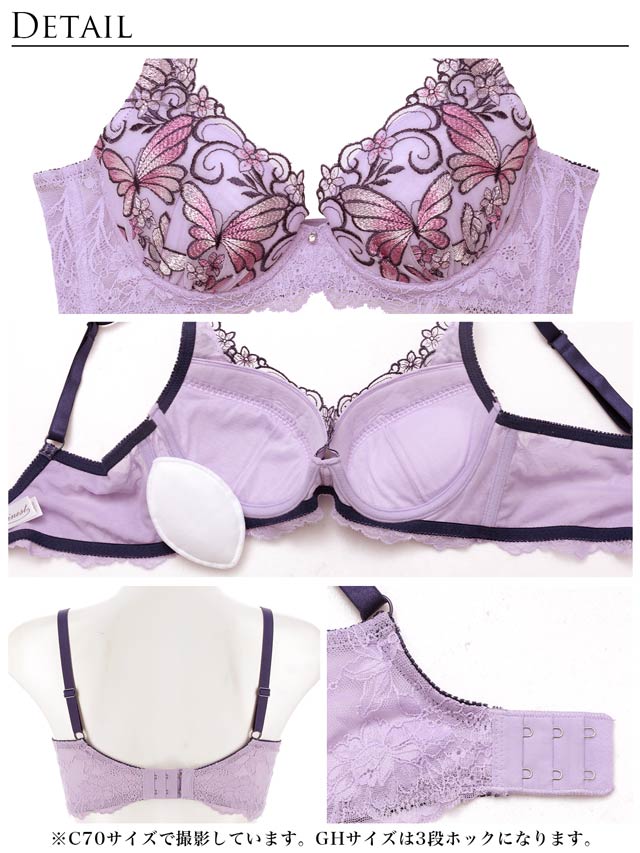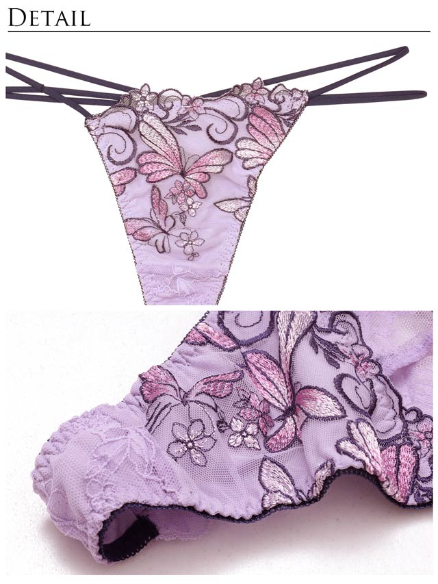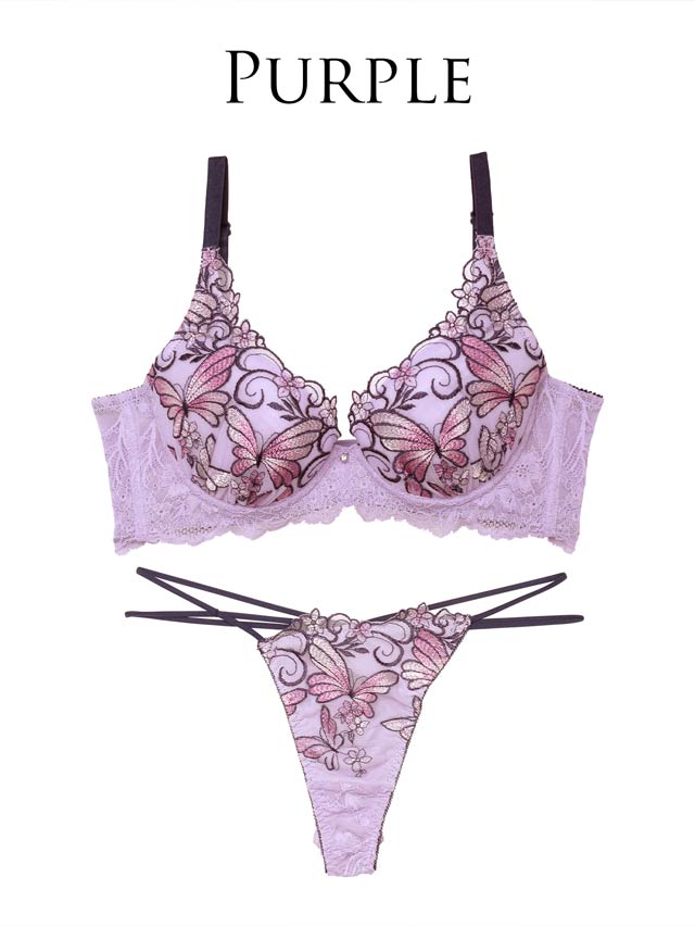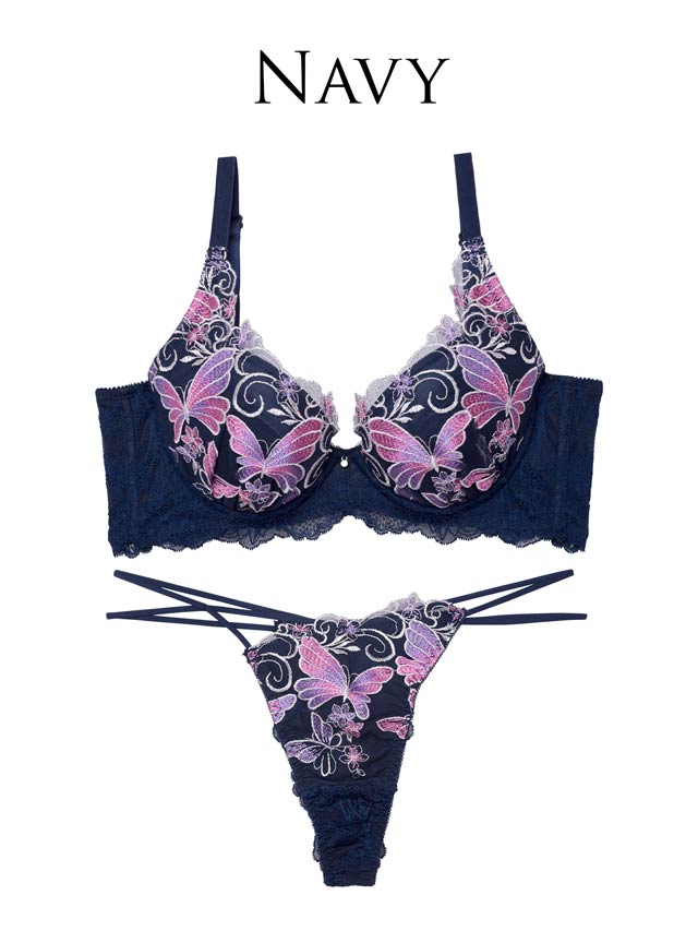 優美なグラデーションカラーの蝶と小花の刺繍を施した華やかで気品漂うランジェリー。U字ワイヤー×脇高構造で胸全体をしっかりと持ち上げ、ふっくらボリュームのあるバストをメイク◎ショーツはフロントの斜めデザイン&華奢なストリング仕様でさりげない色気をプラスしました。