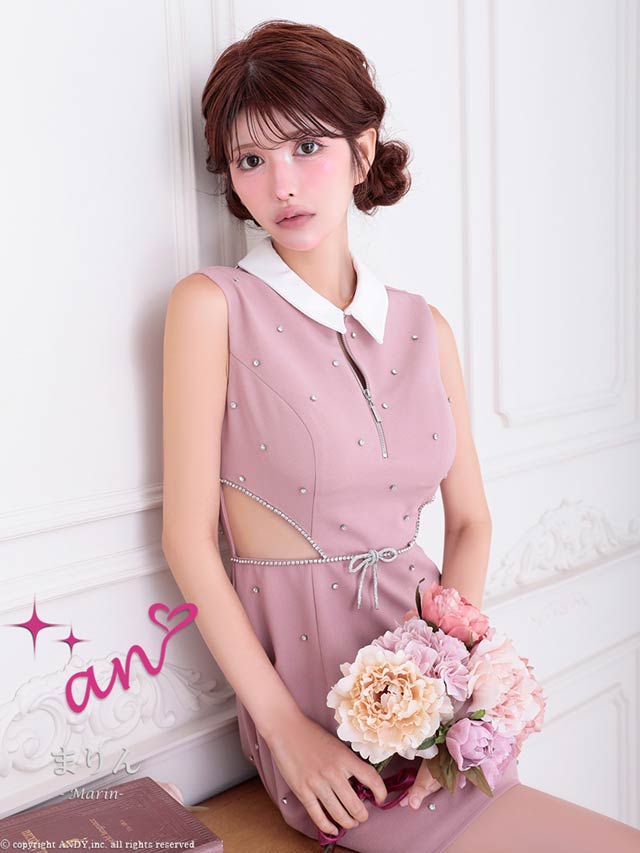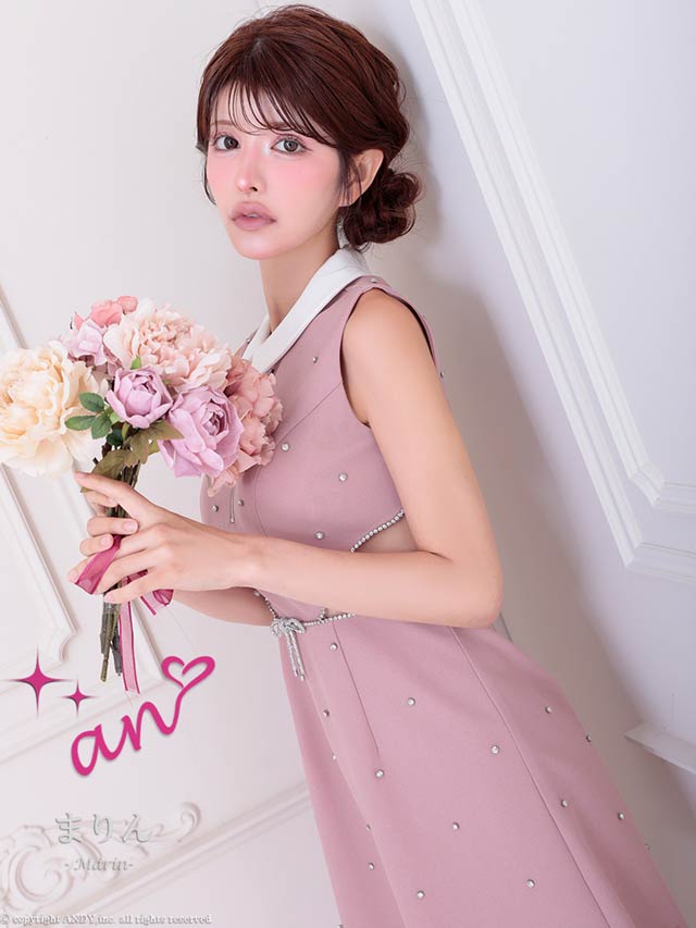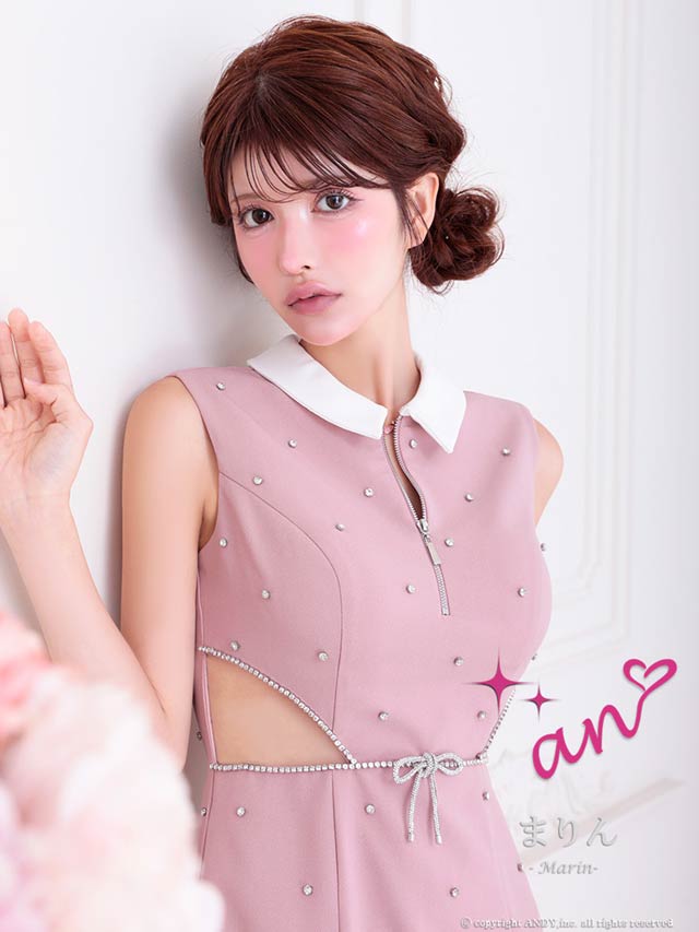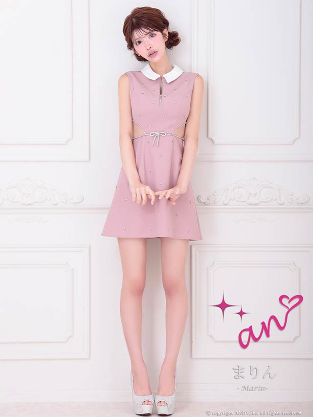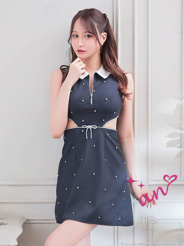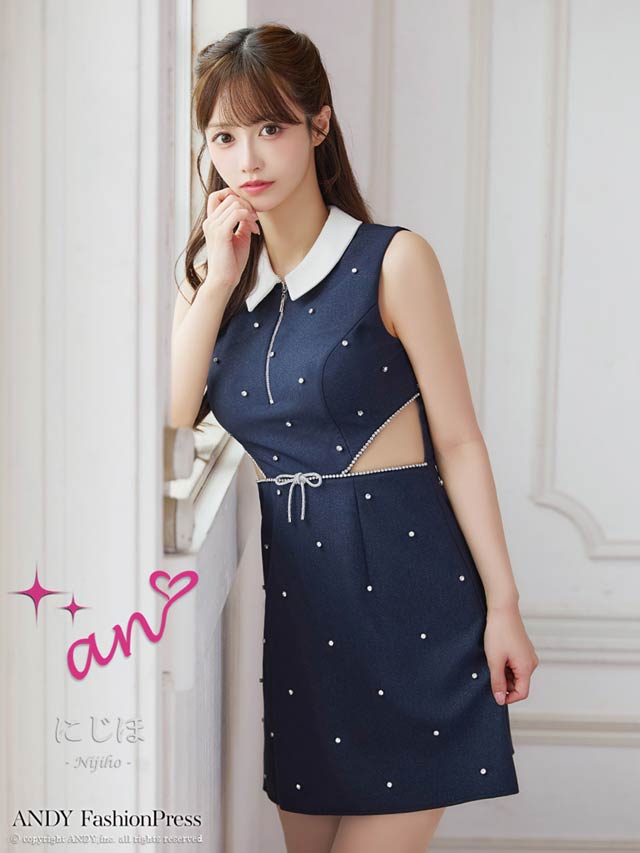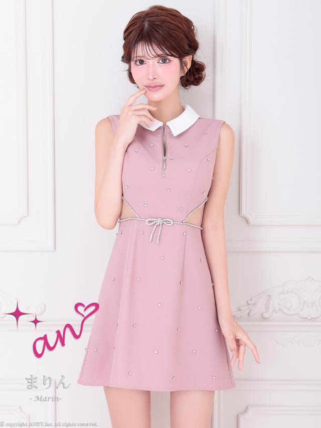 7/16新作!【ポイント20倍】[an]襟付きラインストーンリボンサイドカットAラインミニ丈キャバドレス[AOC-3924]