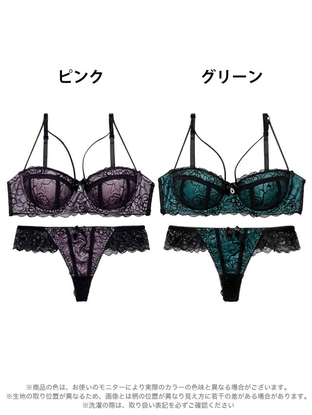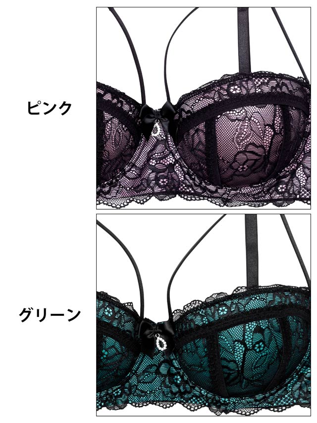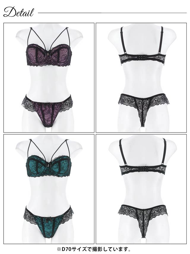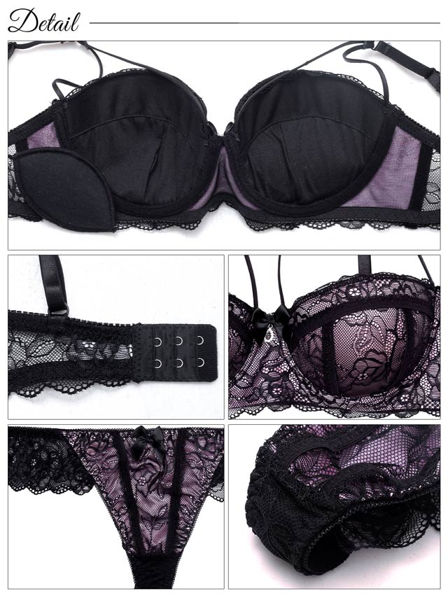 透け感のある繊細なブラックレースやバストを強調するコードデザインがセクシーさ満載のランジェリー。しっかり盛れるダブルパッド×ハーフカップ仕様で、美しいデコルテラインを演出♪総レースのショーツはお洋服にひびきにくいだけでなく履き心地も快適です◎