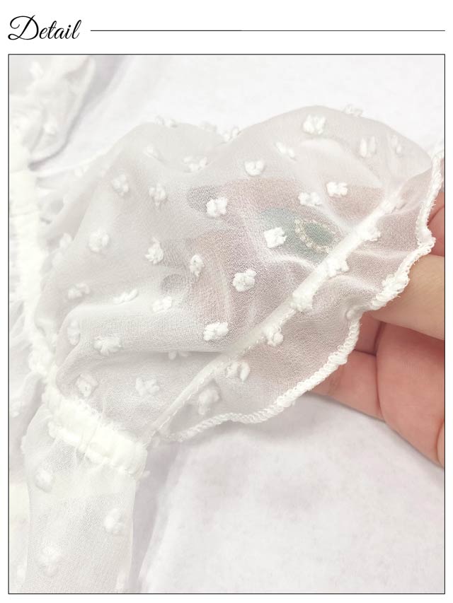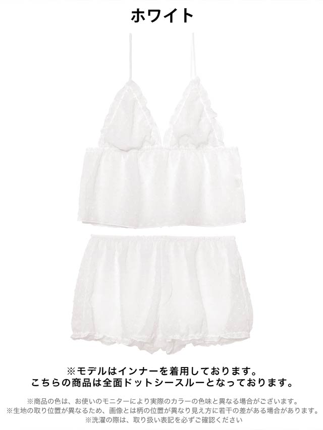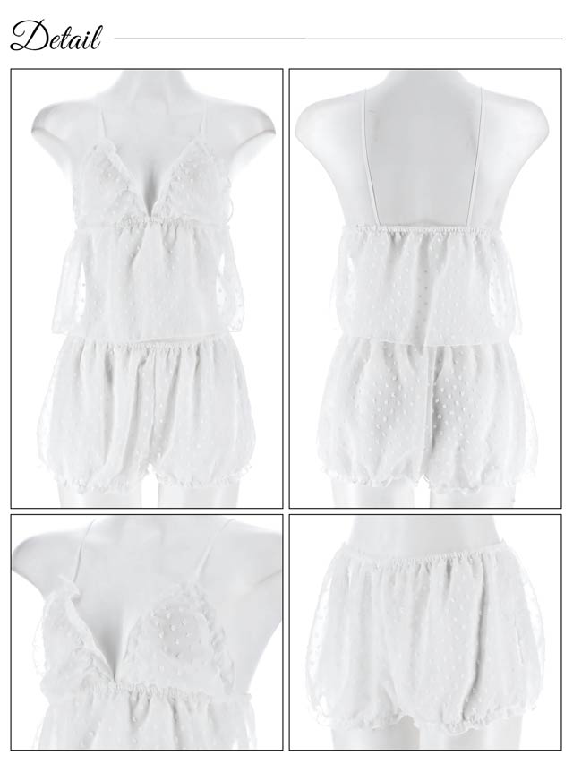 ふんわりと透け感のあるシフォン素材にドット柄のレース生地がキュートなキャミソール&タップパンツルームウェア。バスト周りやパンツの脚口のフリルラインが甘さの中にもセクシーさをプラスした1着です♪