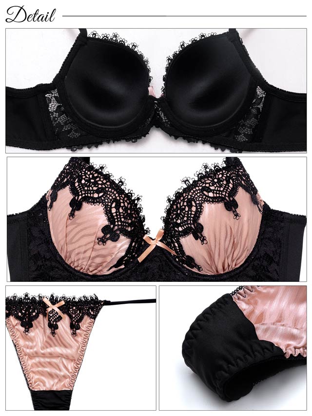 ゼブラ柄調の光沢サテンに、繊細なブラックケミカルレースを重ねた大人セクシーなランジェリー。フロントにあしらわれた小さなリボンがさりげなく可愛らしさをプラス♪ショーツのサイドは華奢なストリングデザインで女性らしさと色気を引き立てます。