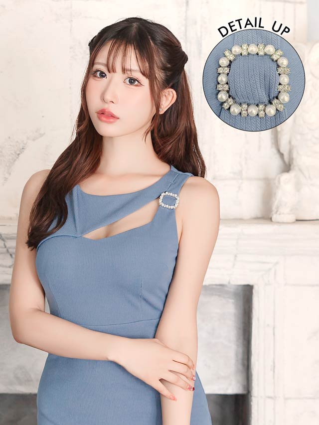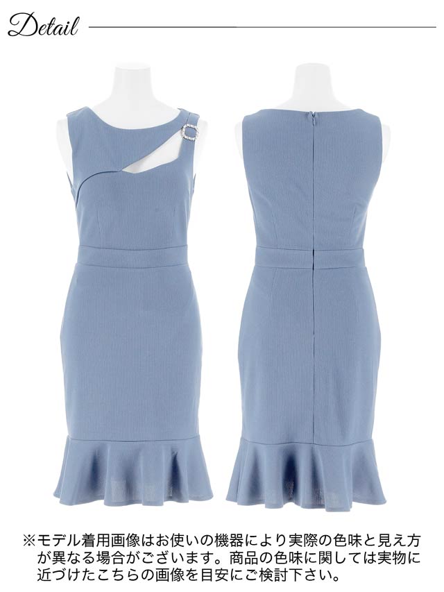 アシンメトリーにカットされたデコルテ魅せがこなれ感漂うミニドレス。キラリと輝くバックルビジュー付きの肩紐が高見えポイント♪ 曲線美を際立たせるリブ加工やマーメイドシルエットが女性らしい1着です。