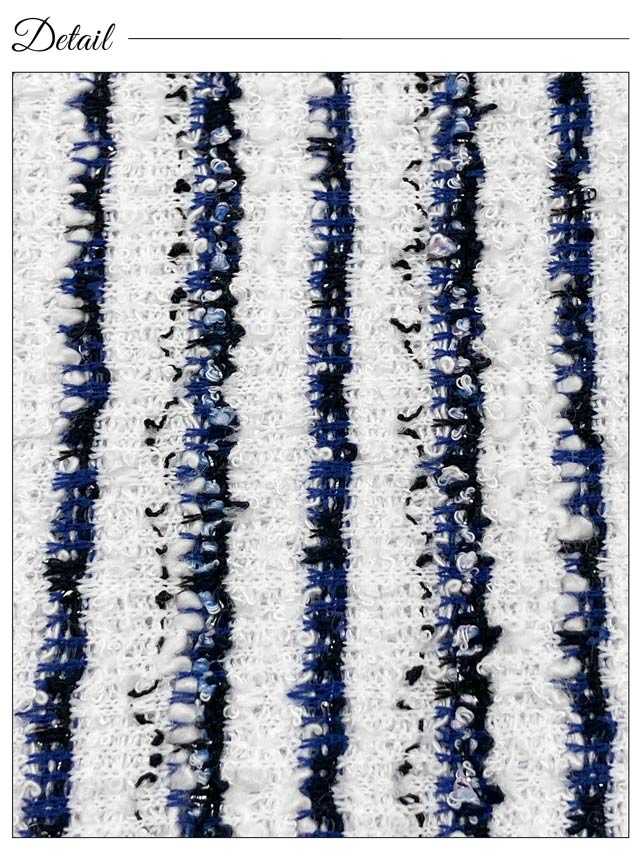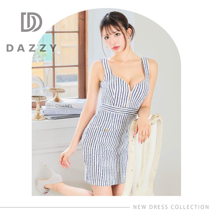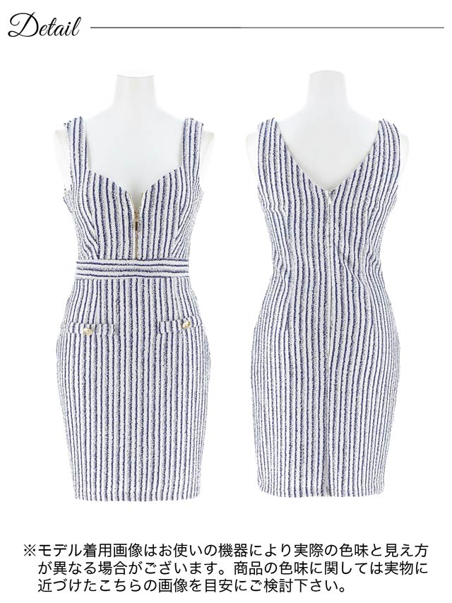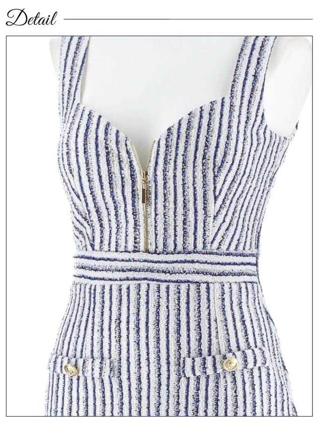 サマーツイードを使用したマリン風ストライプが夏らしく爽やかな印象を与えてくれるミニドレス。胸元には人気のフロントジップを加えお好みで谷間の魅せ方をアレンジ♪ ハイウエストの切り替えが脚長効果もばっちりな1着です。