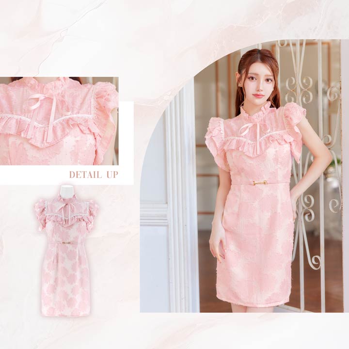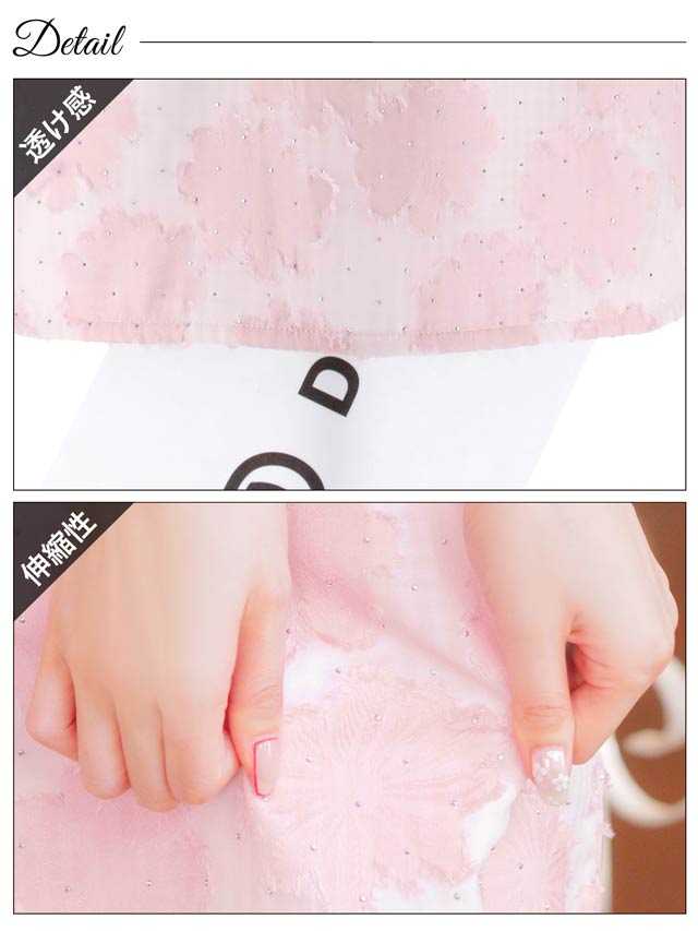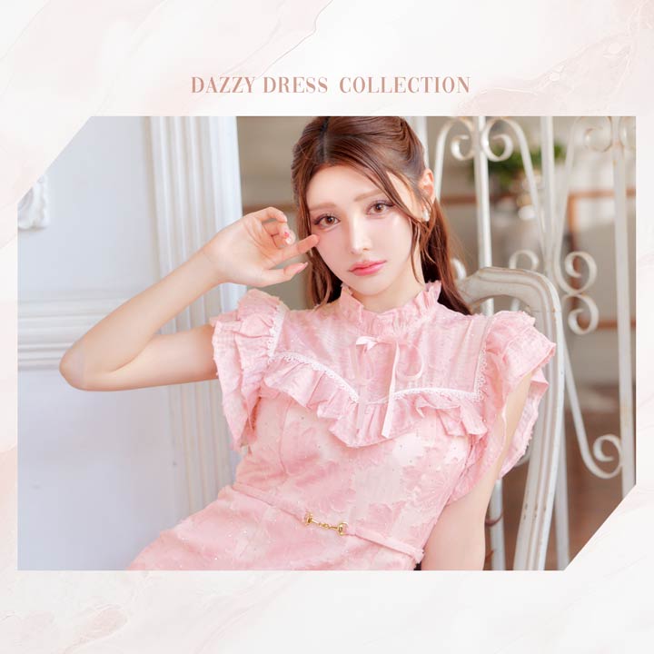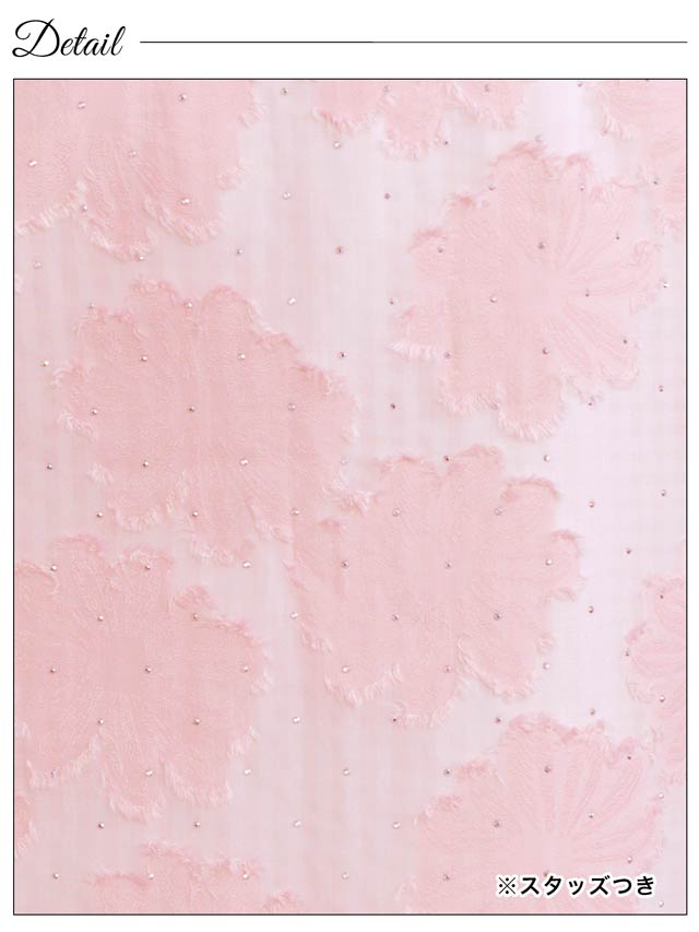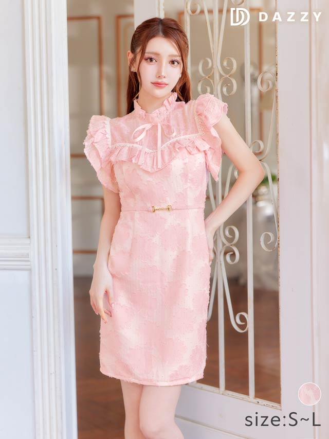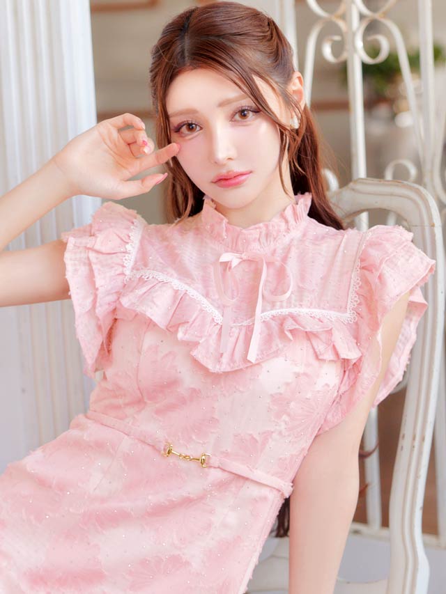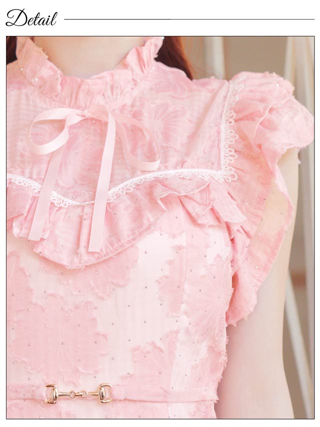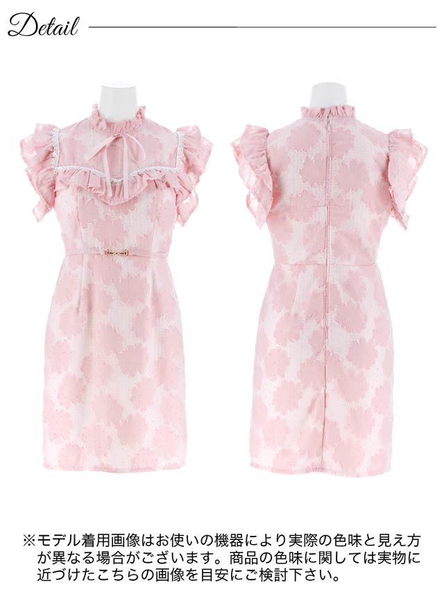 フラワー柄のオーガンジーと煌びやかなラインストーンを散りばめたキュートなミニドレス。透け感のあるデコルテにリボン付きのハイネックで上品な色気を演出します◎ 胸元から袖部分のたっぷりフリルも甘くてかわいい1着です♪