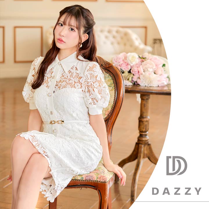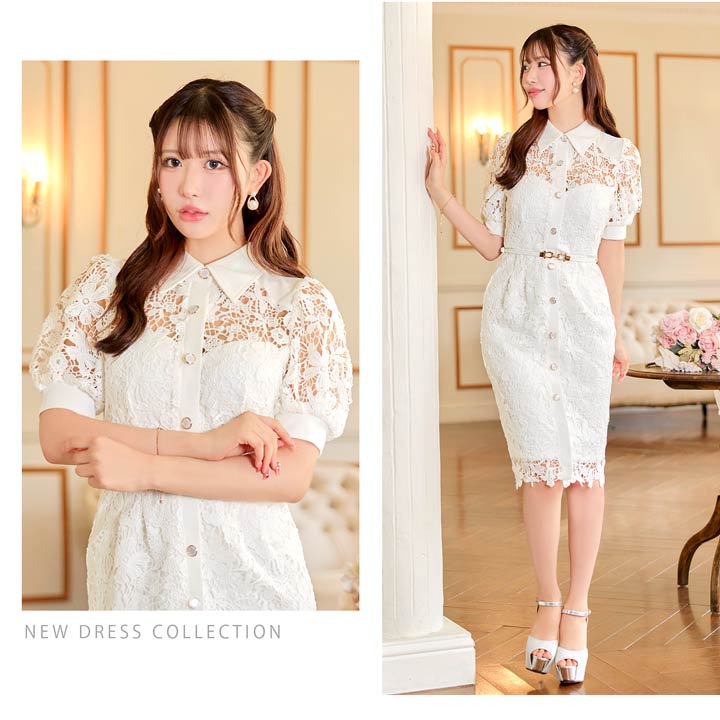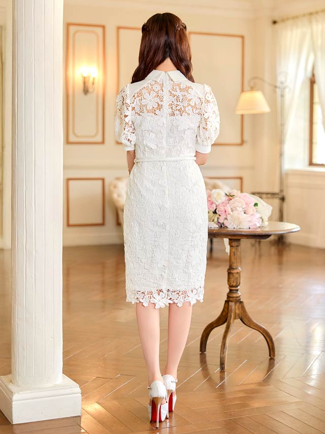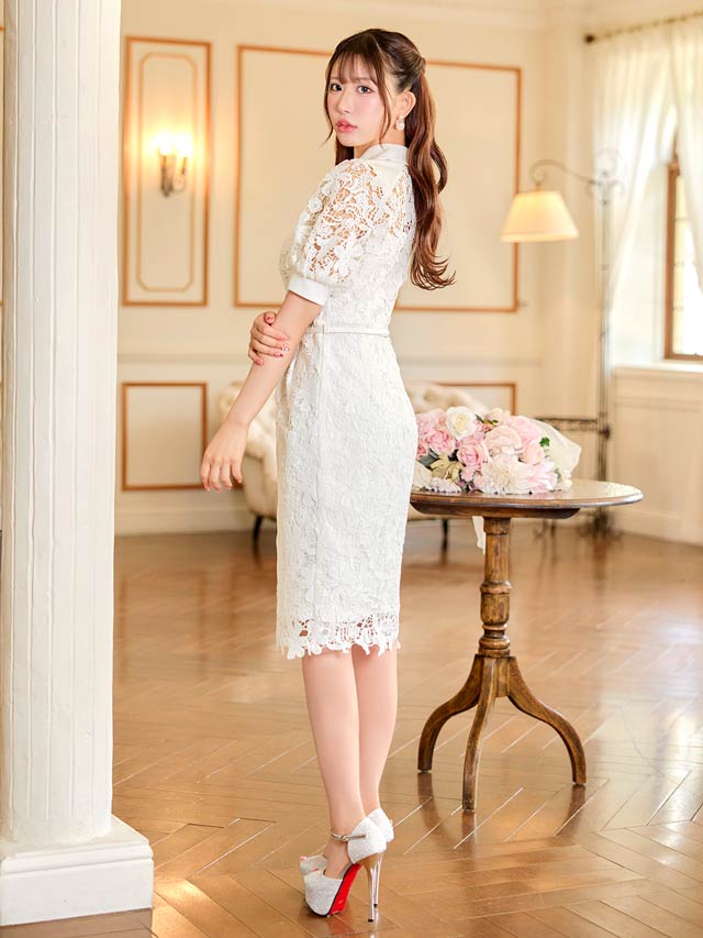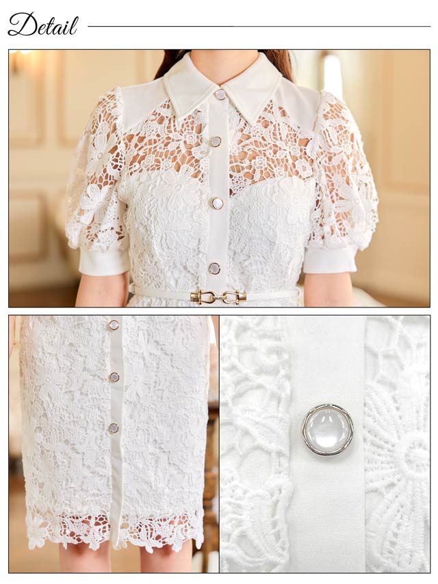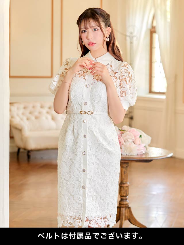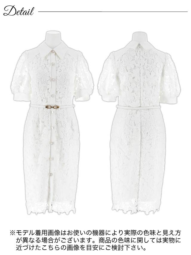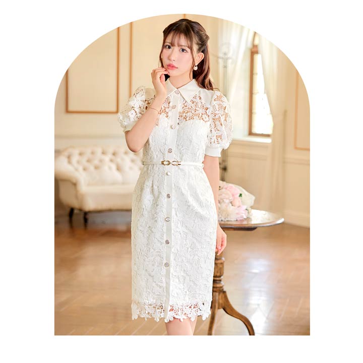 高級なケミカル編みのフラワーレースを全面にあしらった膝丈ドレス。シルエットにメリハリを付けてくれるベルト付きでウエストをしっかりマークします◎ ふんわりとしたパフスリーブもエレガントな印象を与えてくれる1着です。
