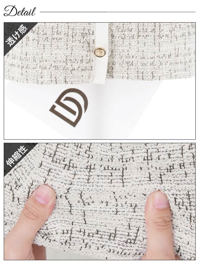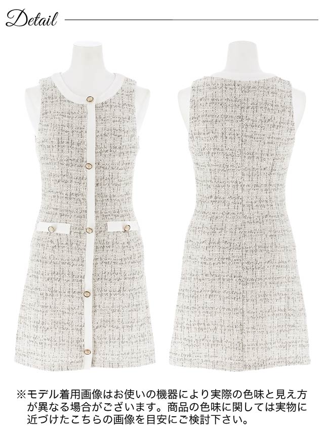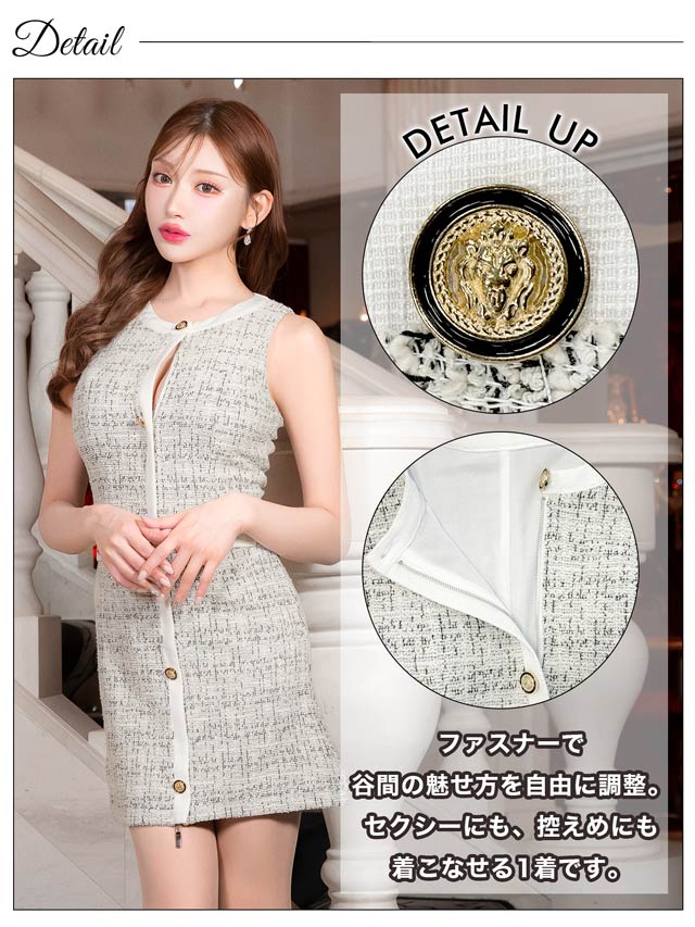 万人受けな品のあるツイードにゴールドボタンで高級感を添えたミニドレス。フロントにはバストをチラ見せするファスナー付き♪自由に調整して露出控えめにもセクシーにも着こなせちゃいます!伸縮性のあるストレッチツイード素材なので着心地が快適なのも魅力です◎