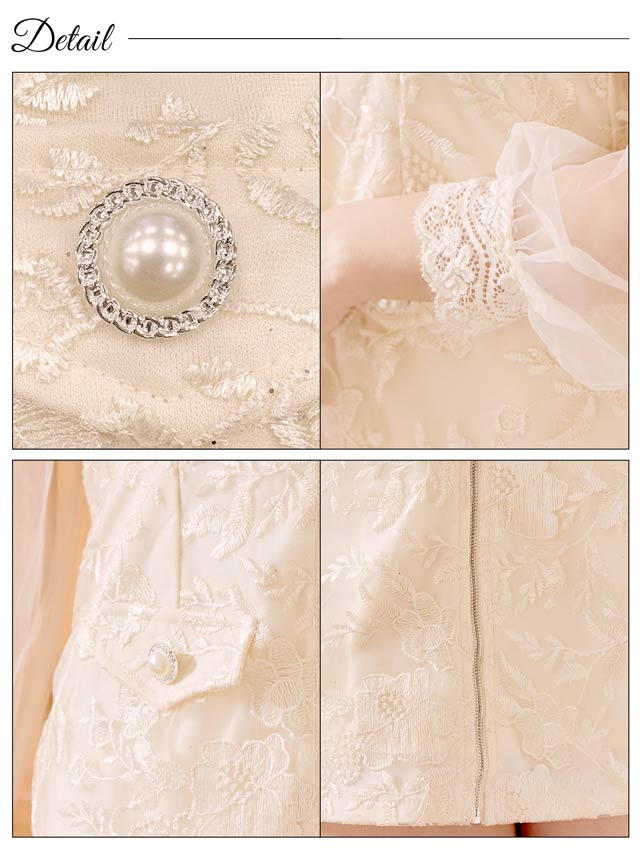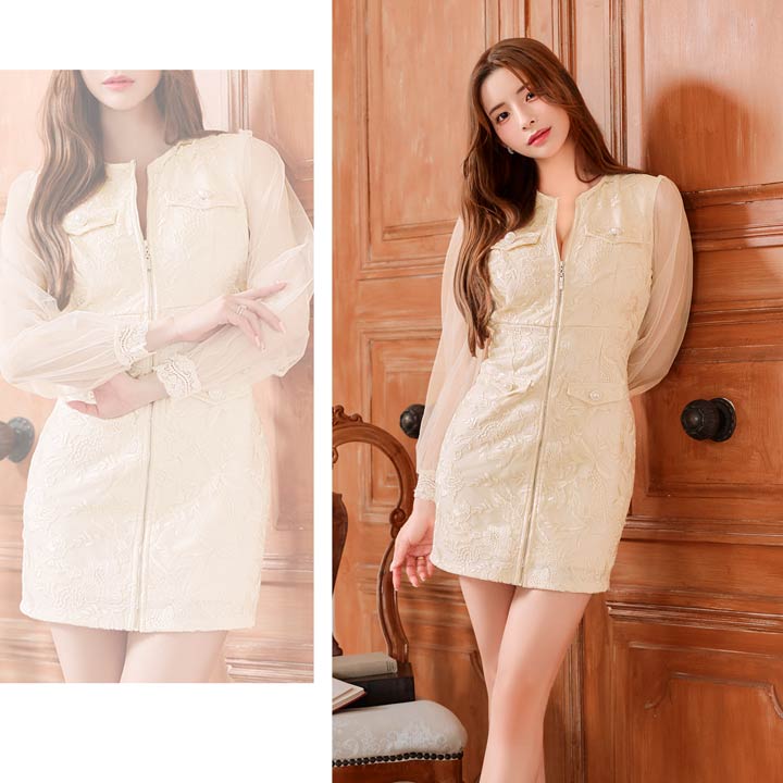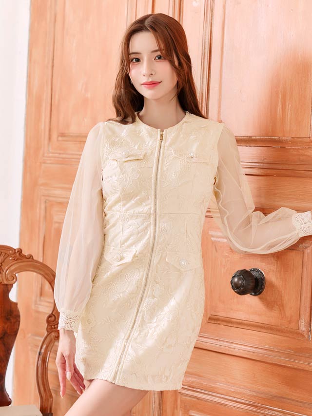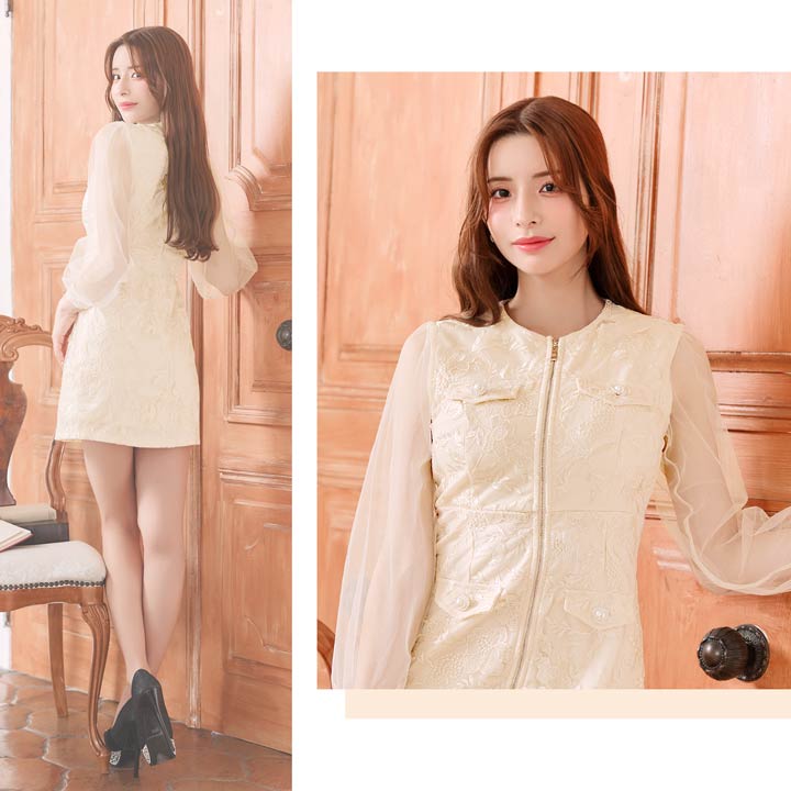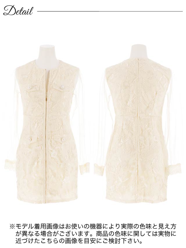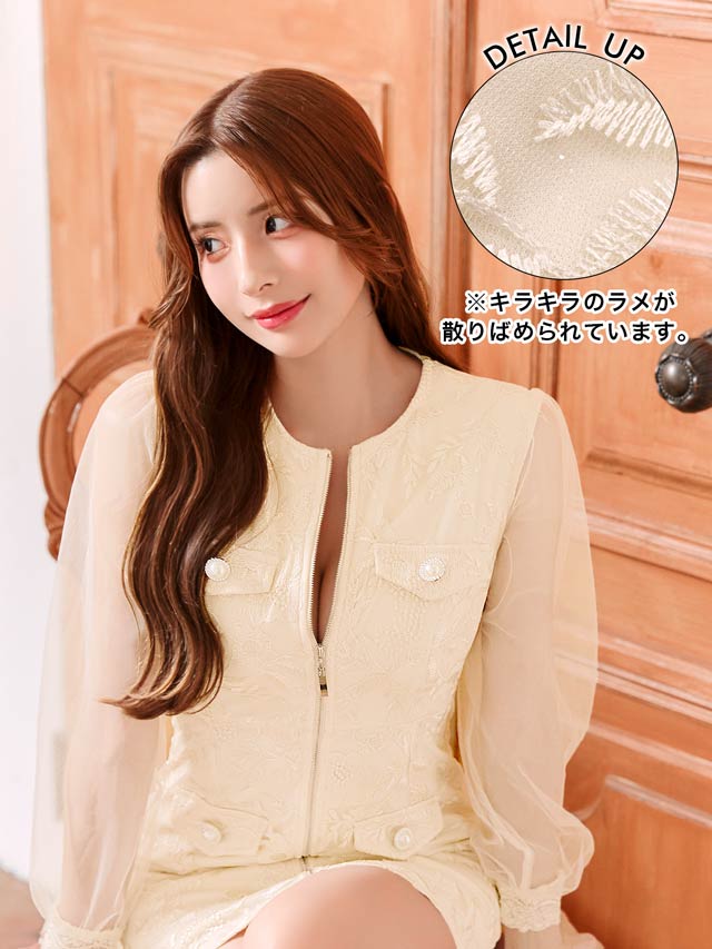 立体的なフラワー刺繍ときらめくラメをあしらった華やかで高級感漂うミニドレス。ふんわりとしたシアースリーブが上品な透け感を演出し、気になる二の腕を自然にカバー◎調節自在なフロントジップ付きで、セクシーに谷間を見せたり露出を抑えたりお好みの着こなしが楽しめます♪