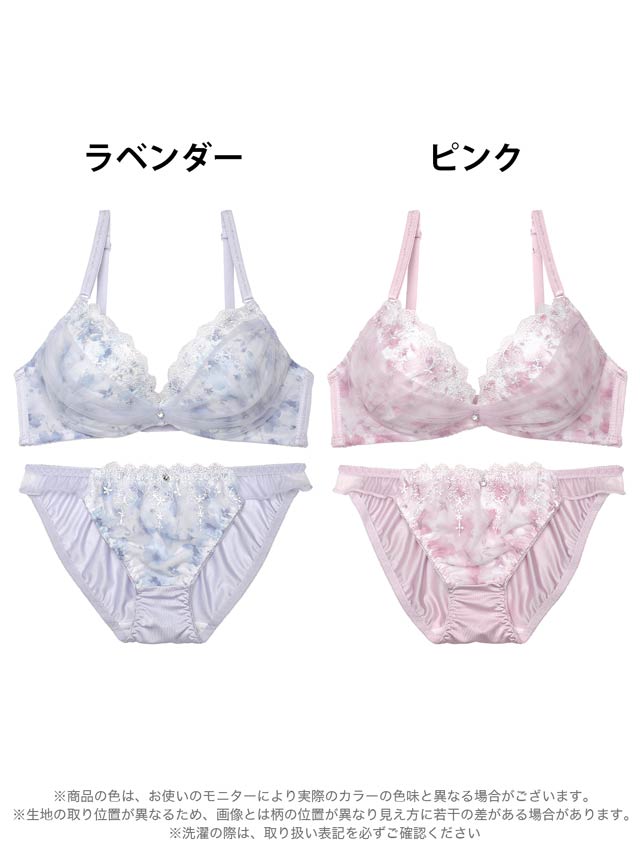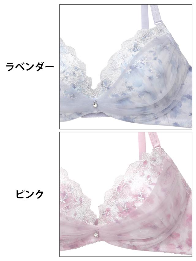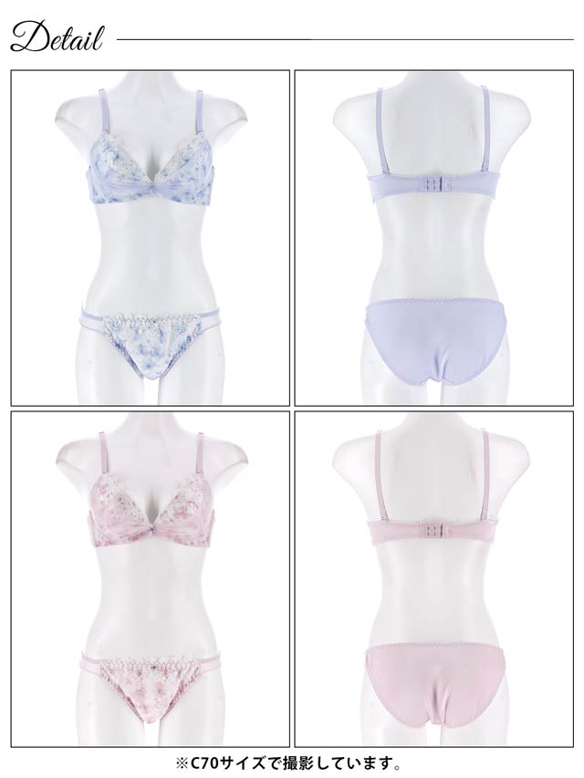 フラワープリントをあしらったカップに、繊細な刺繍のチュールレースとシフォンを重ねたランジェリー。ふんわりと軽やかなシフォンが優雅でフェミニンな雰囲気を演出します♪ショーツはデイリー使いに最適なフルバック仕様。サイドのさりげない透け感がポイントです!