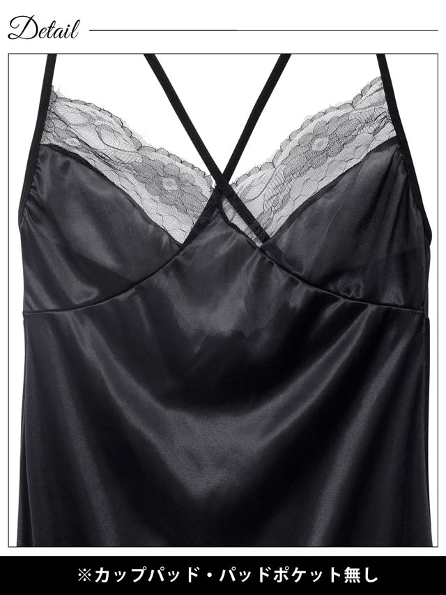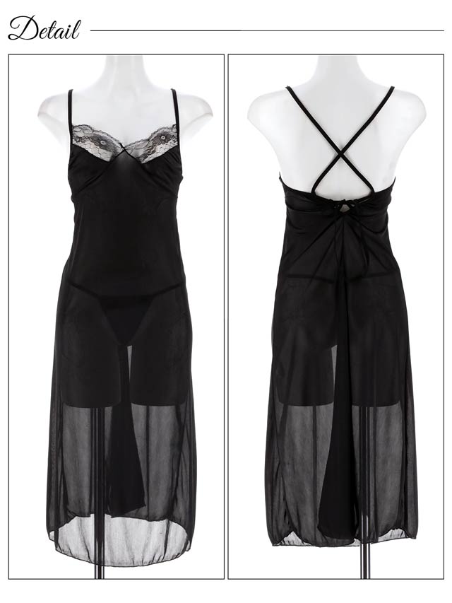 胸元が透ける繊細なレース使いがアクセントになったエレガントなロング丈のルームウェア。大胆に背中を見せるバッククロスデザインで後ろ姿までセクシーに演出します♪肌あたりの良いさらっとした素材でおうちでリラックスタイムにぴったりです◎