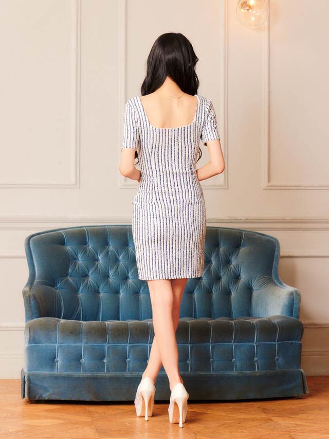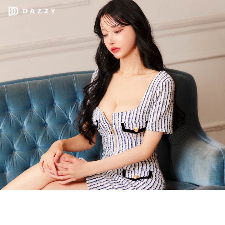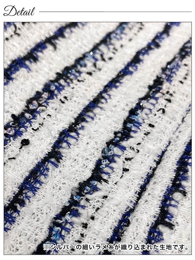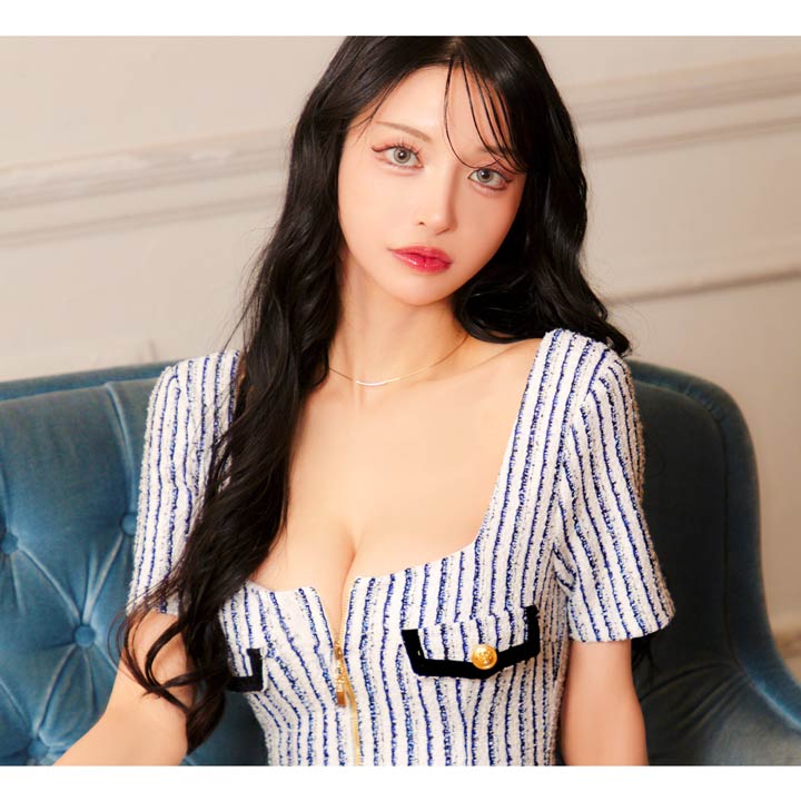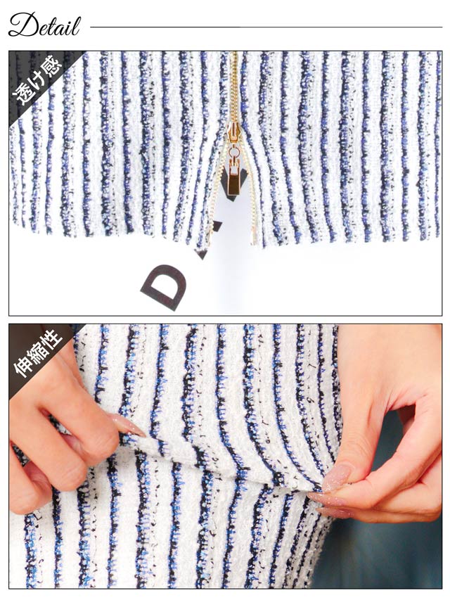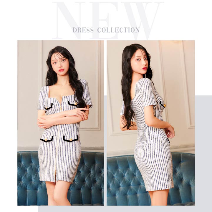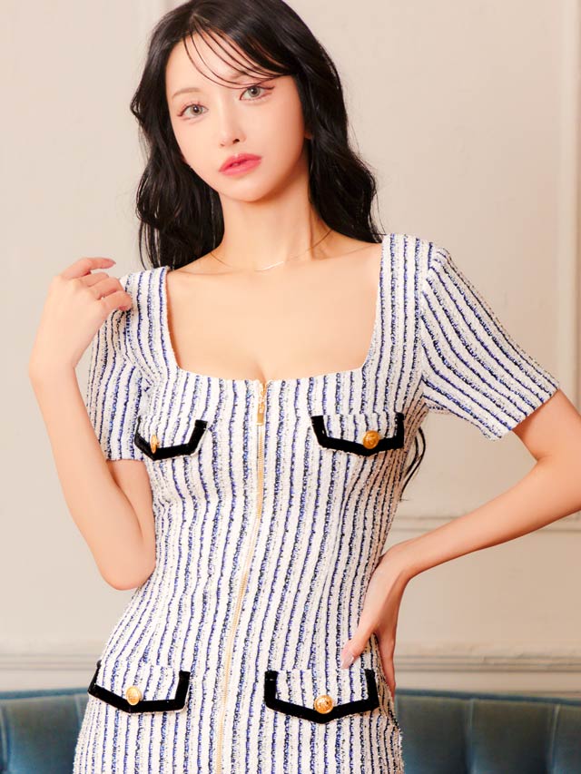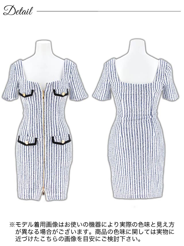 マリン風なツイードストライプがヘルシーな印象を与えてくれるミニドレス。スカート裾まであしらわれたフルジップ仕様で谷間やスリット間隔が自由自在♪ パイピング加工のポケットモチーフもアクセントになった1着です。
