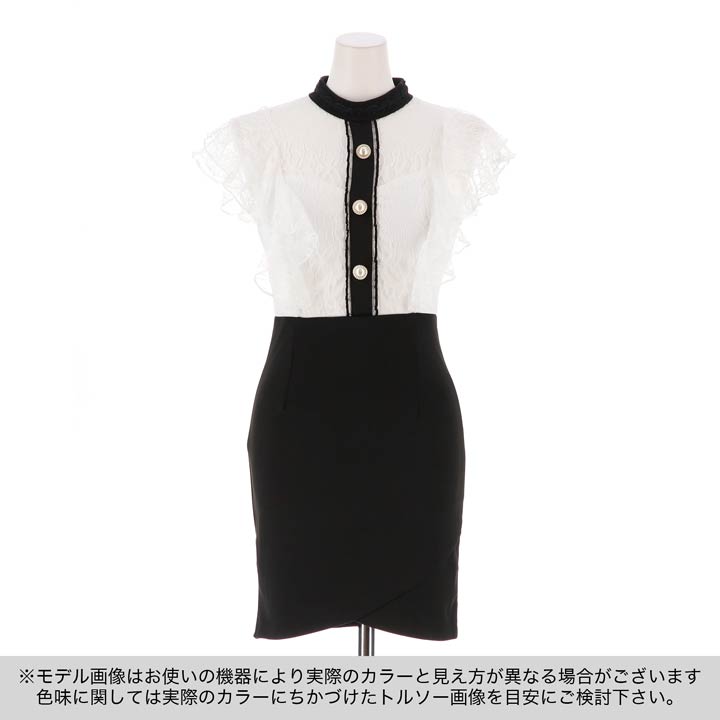 [SMLサイズ]シースルーレースパールボタンフリル袖タイトミニドレス[3サイズ展開]