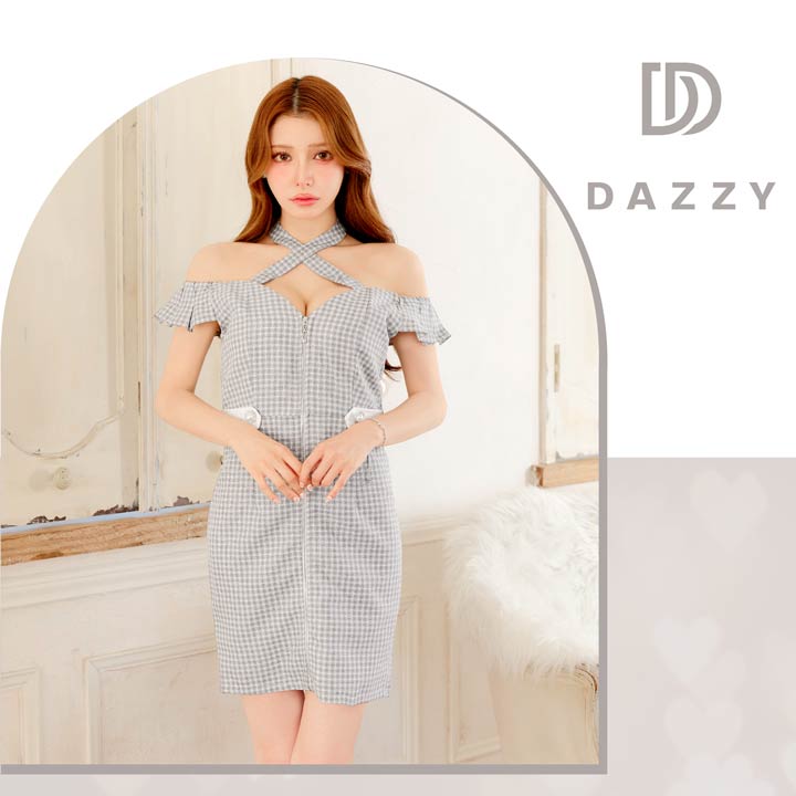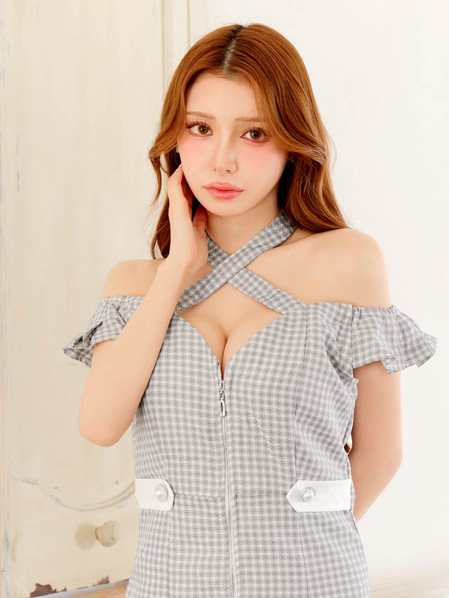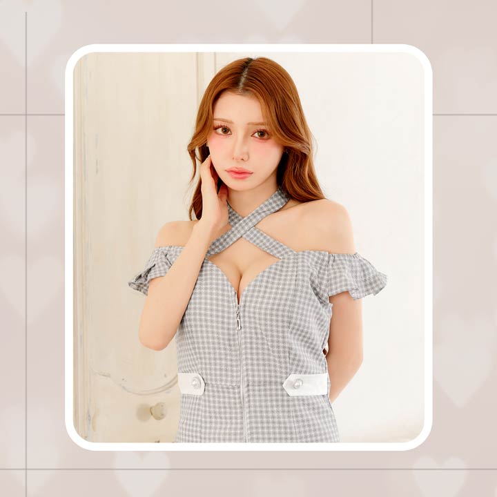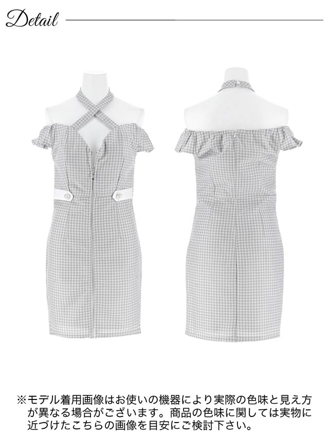 ギンガムチェック柄の生地にデコルテから首周りを華やかに演出するクロスネックがアクセントになったミニドレス。人気のフロントジップとキュートなフリルのオフショルデザインが甘さの中にもセクシーさをプラスした1着です。