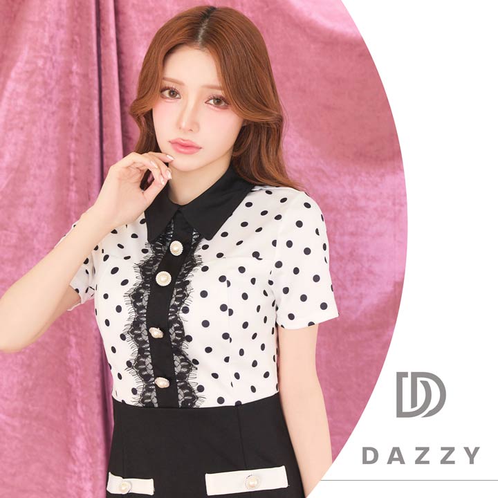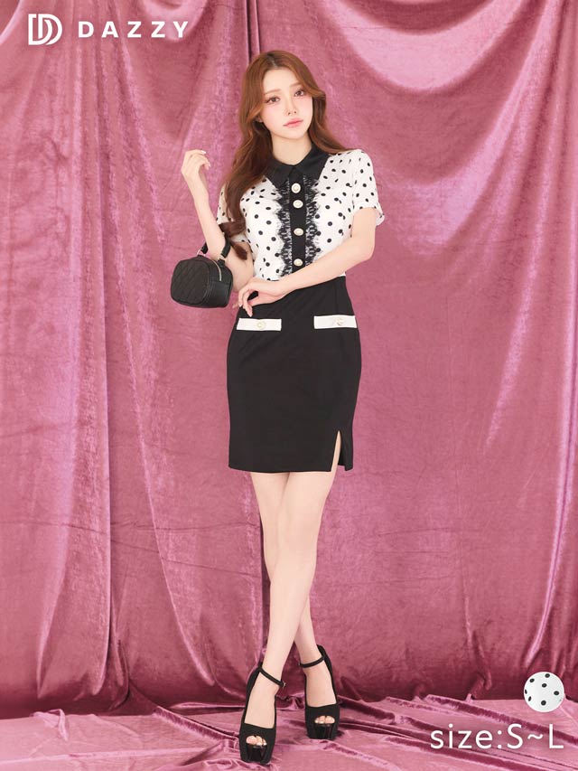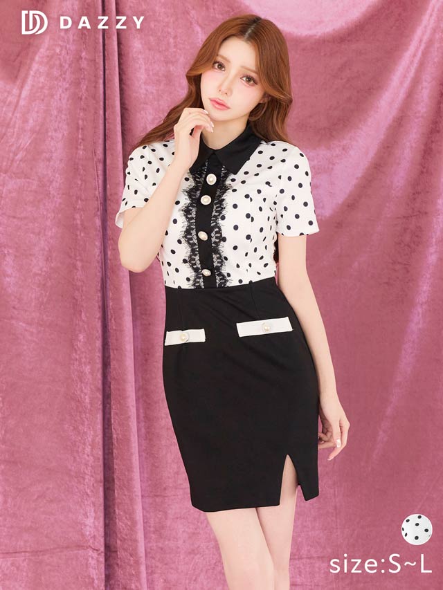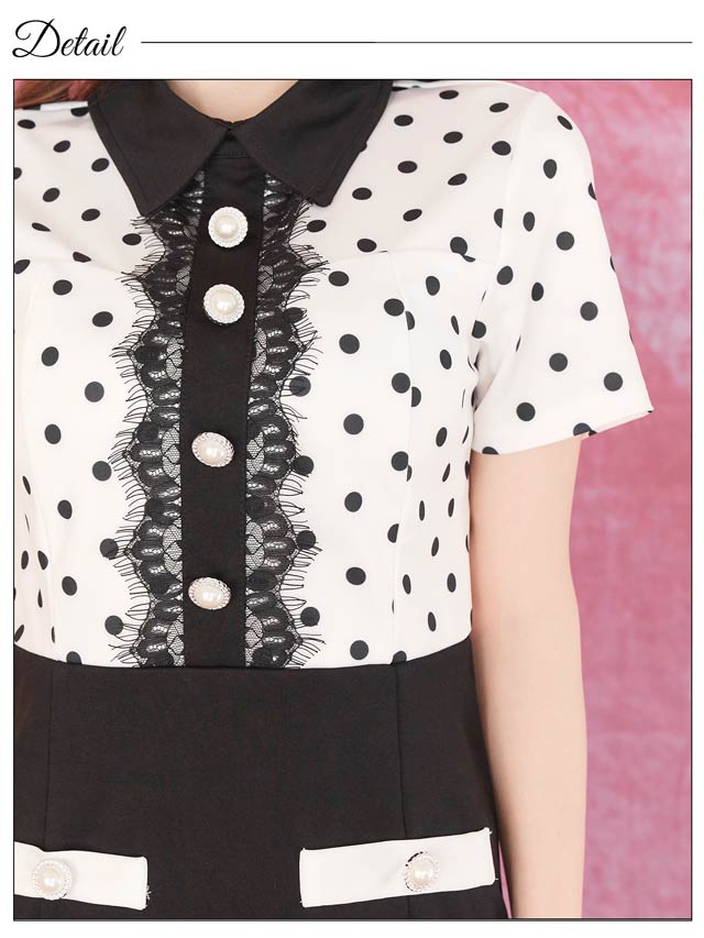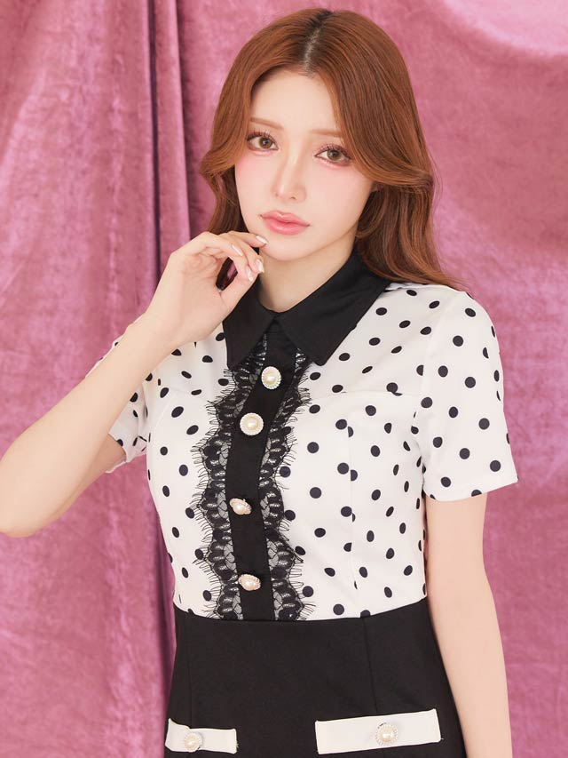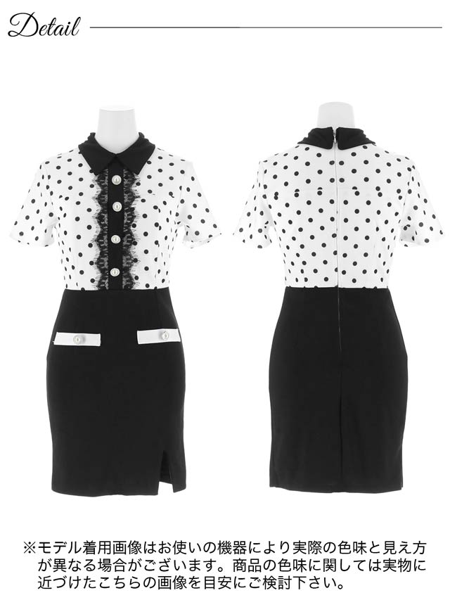 モノトーン配色のドット柄が印象的なミニドレス。襟付き仕様にレース×パールビジューのフロントラインが大人かわいいアクセントに◎ ちらっと見える太腿のスリットがセクシーさも欠かさない1着です♪