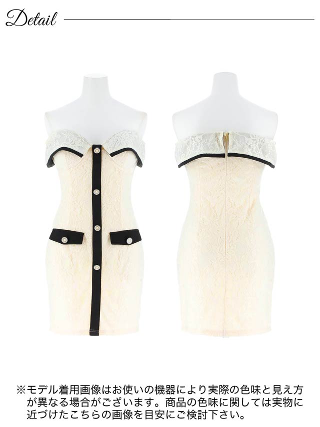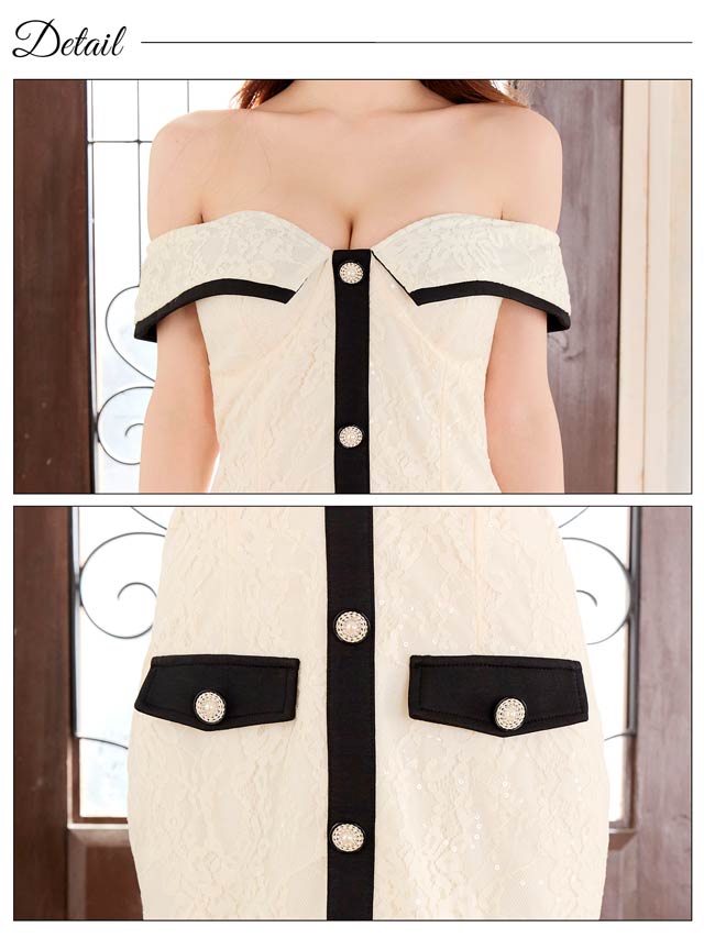 繊細なレース生地にバイカラー配色のフロントラインが美シルエットを演出してくれるミニドレス。大胆なオフショルデザインで女性らしい華奢な肩魅せをしっかりアピール◎ 煌びやかなボタンビジューで高見え要素を加えた1着です。