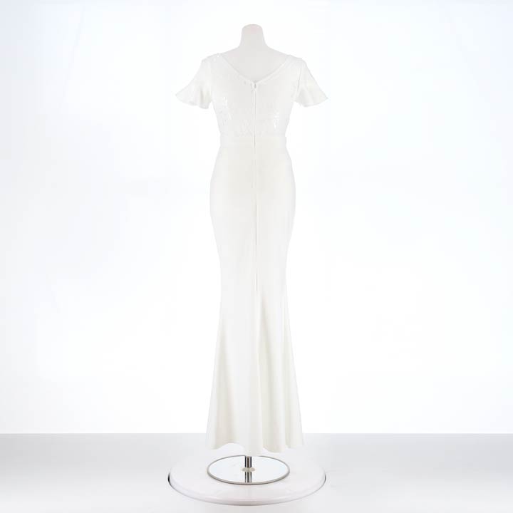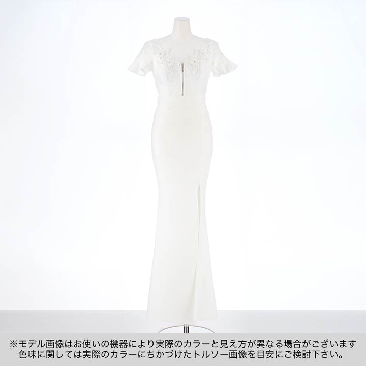 全身ホワイトワンカラーのロングシルエットが美しい女神ドレス。フロントファスナーとデコルテのクロスビジューが胸元に視線を引きつけます◎ 女性らしいフリル袖で二の腕を華奢魅せ出来る1着です♪