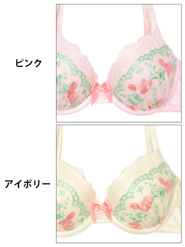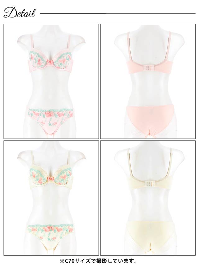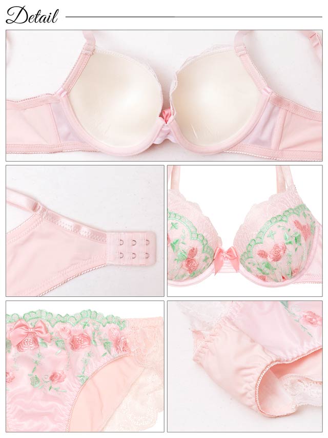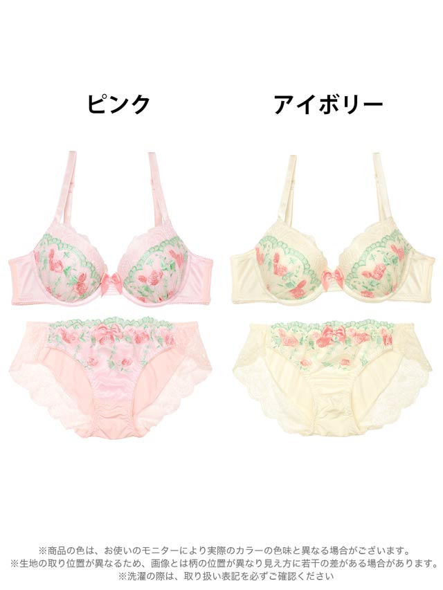 柔らかいパステルカラーに可愛らしいピンクローズが咲き誇るランジェリー。アーチやアイビー刺繍の差し色で華やかさをグッとアップしてくれます♪ レース生地と切り替えたショーツはラインが透けるのを防いでくれるのもポイントです◎