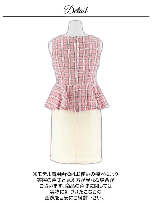 ラメ糸をあしらったチェック柄ツイードが華やかでフェミニンな雰囲気のミニドレス。深めのカットアウトと調節自在なジップでセクシーな谷間魅せアピールも◎ふんわり広がるペプラムがメリハリのあるボディラインを演出し、スタイルアップを叶える1着です♪