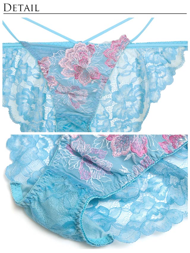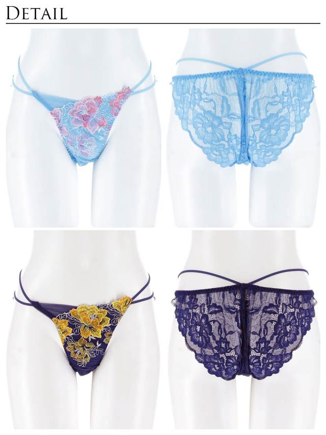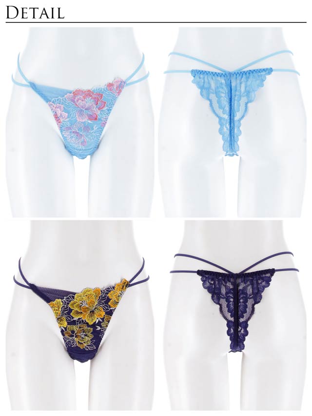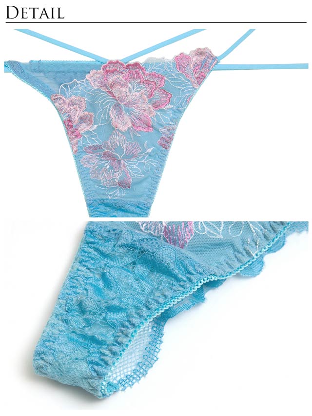 明るい色使いで刺繍されたピオニーの花々が、華やかでラグジュアリーなムードを演出するランジェリー。フロントのアシンメトリーなデザインがアクセントに。サイドはダブルストリング仕様で女性らしい曲線を引き立ててくれます。