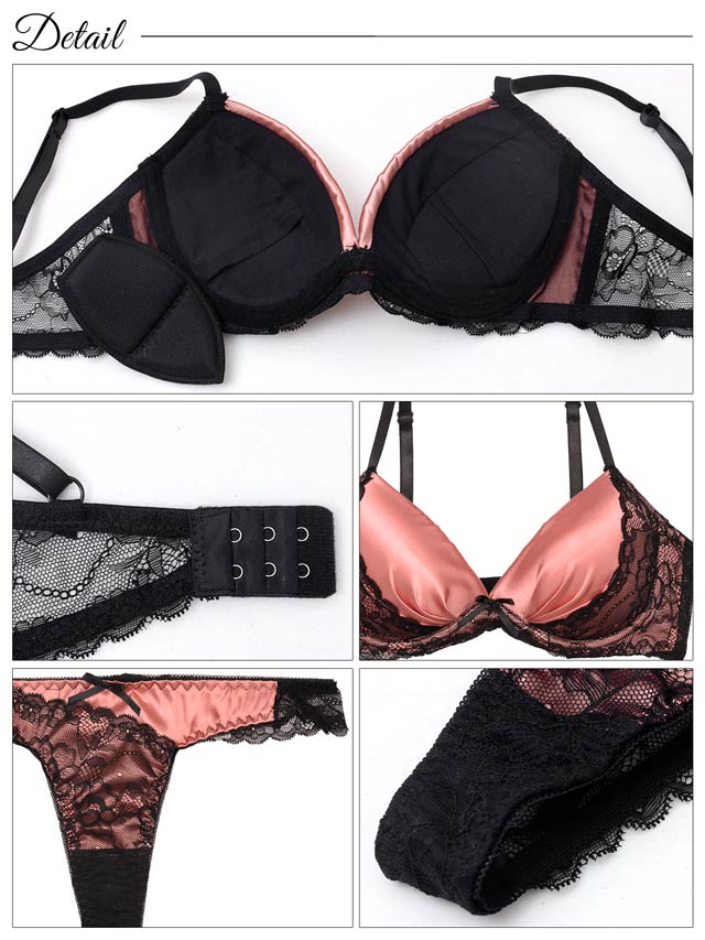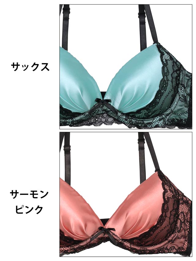 明るいカラーのサテンとブラックレースのコントラストが目を惹く、上品セクシーなランジェリー。中心にあしらったリボンがほんのり女の子らしさをプラス♪ショーツは素肌が透けるバックレース仕様で、後ろ姿まで抜かりなく華やかに見せてくれます◎