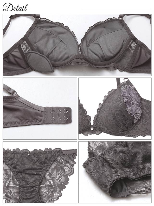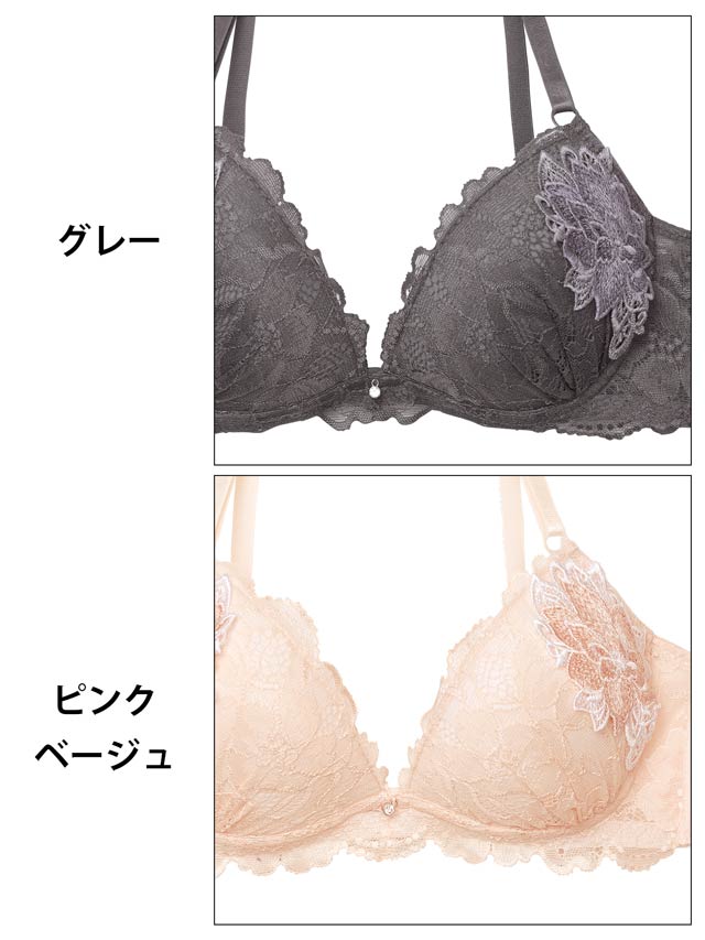 女性らしいレース生地にカップ両サイドにあしらわれた立体的なピオニー刺繍が高級感漂うランジェリー。中央で輝く1粒チャームもワンポイント◎ ショーツは華奢なストリングデザインに、後ろ姿からも色気溢れるバック透け仕様が魅力的な1着です。