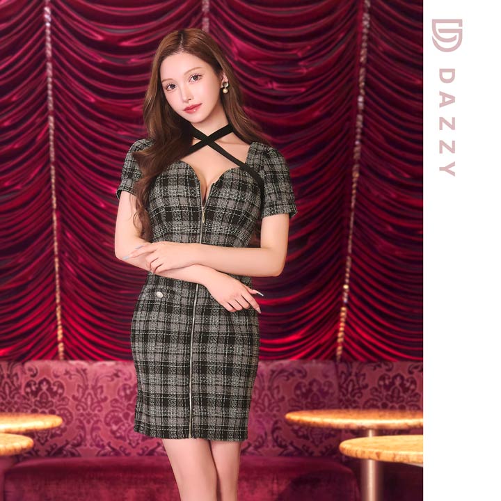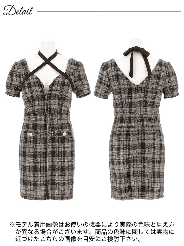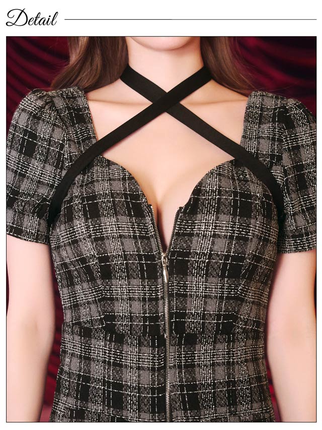 上品なツイードチェック柄にバスト横からあしらわれたクロスネックが華やかさを演出するミニドレス。首元リボンで後ろ姿まで可愛らしさ全開。スカート裾まで施されたファスナーで谷間の魅せ方は自由自在♪ 半袖仕様で二の腕周りをカバーしてくれるのも嬉しいポイントです。フルジップ仕様はお着替えがらくちんで愛用するキャバ嬢さん多数!