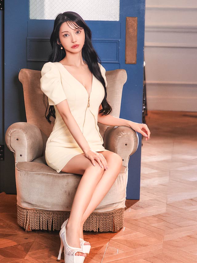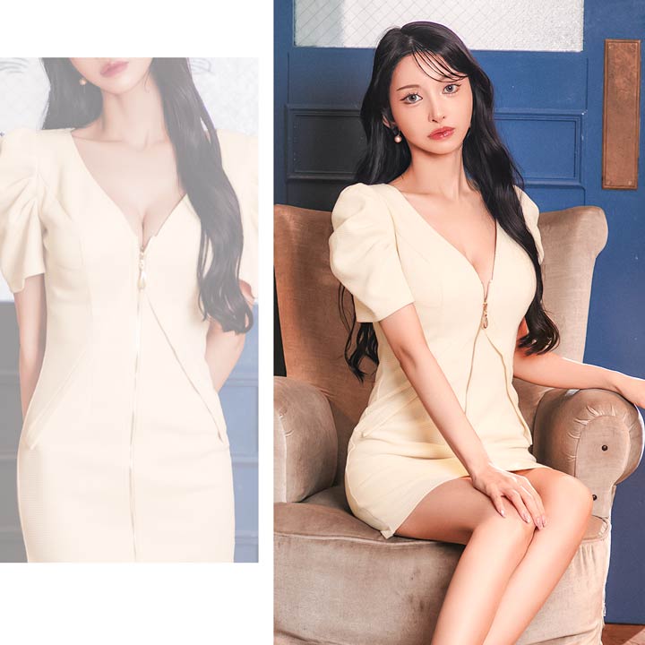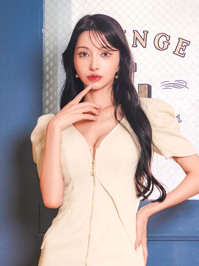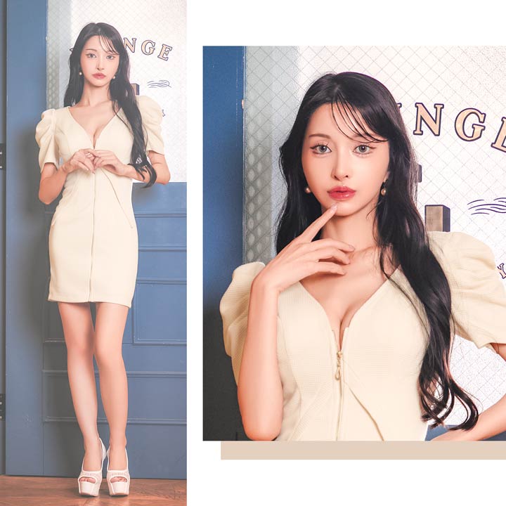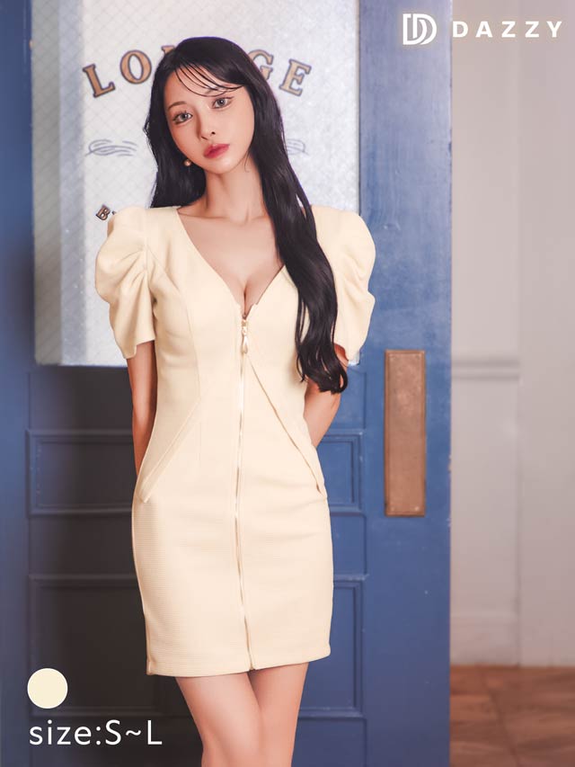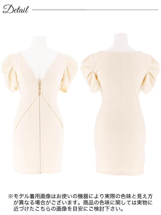 凹凸感のあるワッフル生地に中央の斜めに入った切り替えデザインがオシャレなミニドレス。フルジップ仕様でしっかり谷間魅せしつつ、着脱も楽ちんなのも嬉しいポイントです♪ ボリューム感のあるパフスリーブがエレガントな1着です。