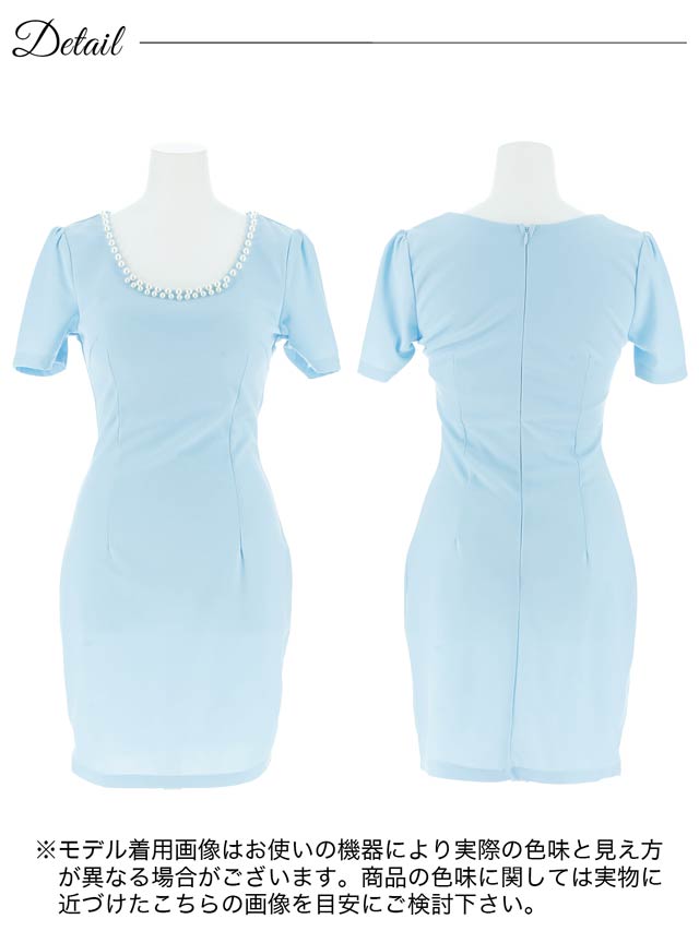 爽やかなブルーのワンカラー仕様にネック周りのパールビジューが美しいミニドレス。程よく開いたU字のデコルテ部分がお顔周りをスッキリと見せてくれます◎ 半袖がさり気なく二の腕周りをカバーをしてくれるのも嬉しいポイントです!