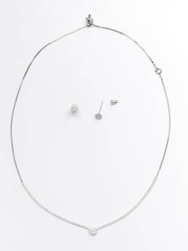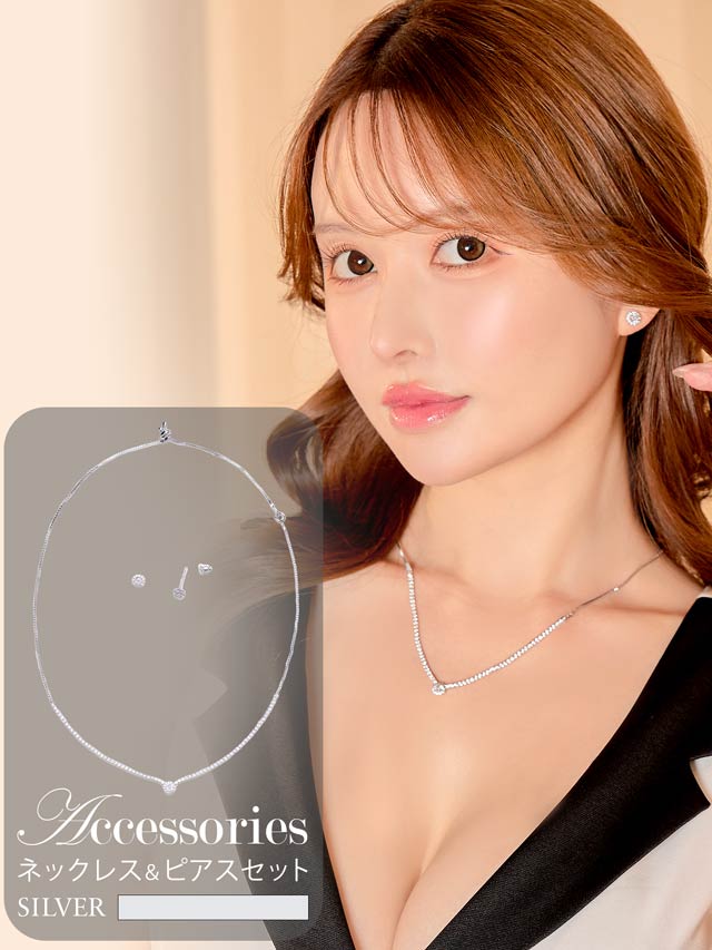 一際存在感溢れる中央の1粒シルバーが美しいネックレス&ピアスセット。チェーン部分にも細かいラインストーンを加えたデザインは首元から気品漂うコーディネートを叶えます◎ フォーマルシーンにもお使い頂けるアイテムです。