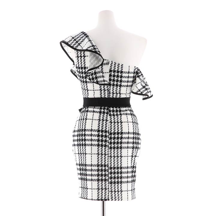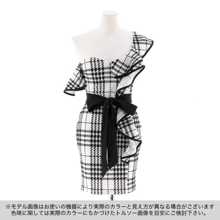 モノトーンなチェック柄とウエストラインのリボンが可愛らしいミニドレス。フリル感のあるワンショルダー仕様で大胆にデコルテと肩見せが出来ちゃいます◎ 色気と可愛いを兼ね備えた1着です♪
