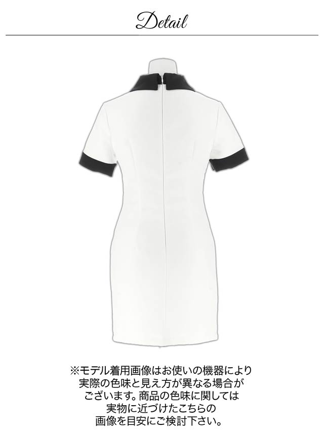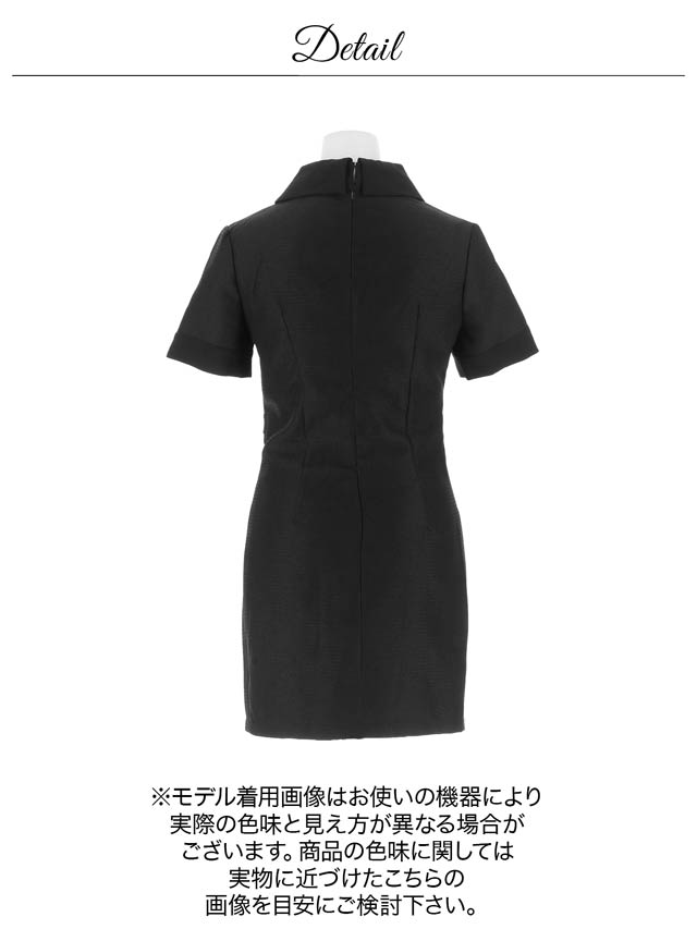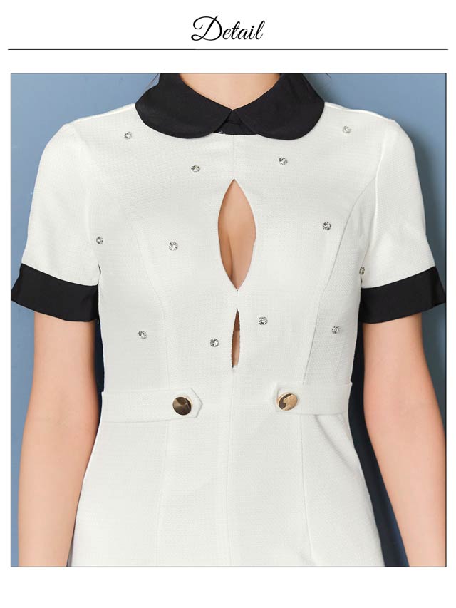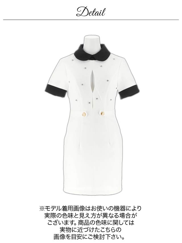 上品さと可愛らしさを兼ね備えた丸襟に大胆なカットアウトで視線を釘付け♪ キラリと輝くラインストーンを散りばめた高級感漂うミニドレス。サイドのベルトモチーフがくびれラインを美しく演出してくれるのもポイントです!