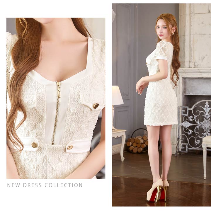 9/11再入荷!フロントジップフラワーレース格子パフスリーブタイトミニ丈キャバドレス[SML/3サイズ展開]
