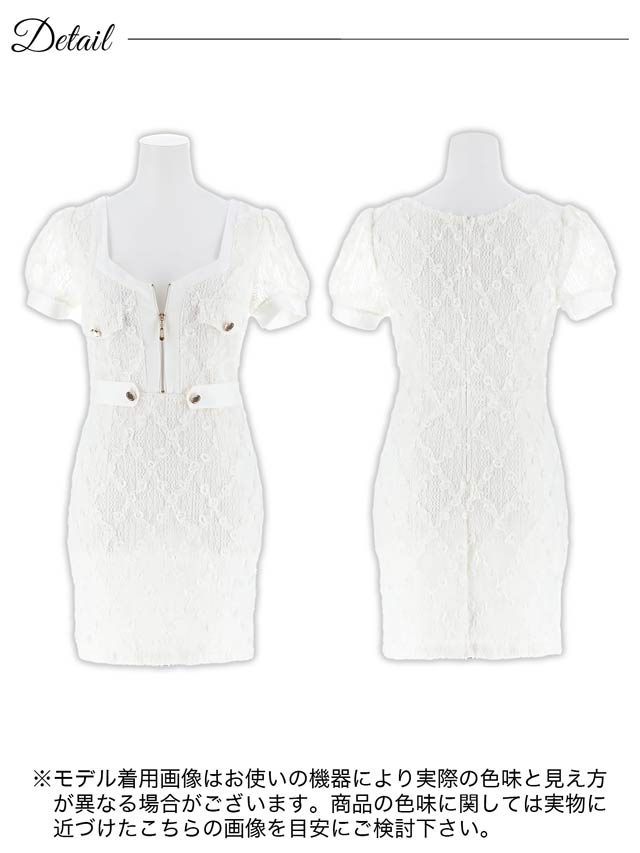 フラワーモチーフをあしらったレース生地の格子柄が華やかなミニドレス。フロントラインに人気のジップを加えデコルテをスッキリとした印象に仕上げました♪バスト下に入れたウエストマークは足を長く見せ、スタイルアップ効果も◎透けレースのパフスリーブは甘さの中に色っぽさを演出してくれる1着です。