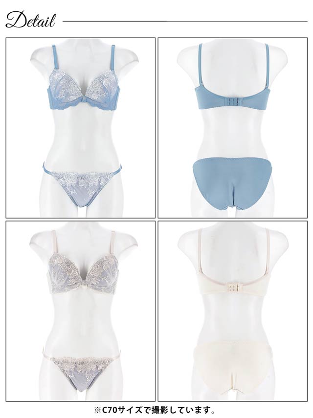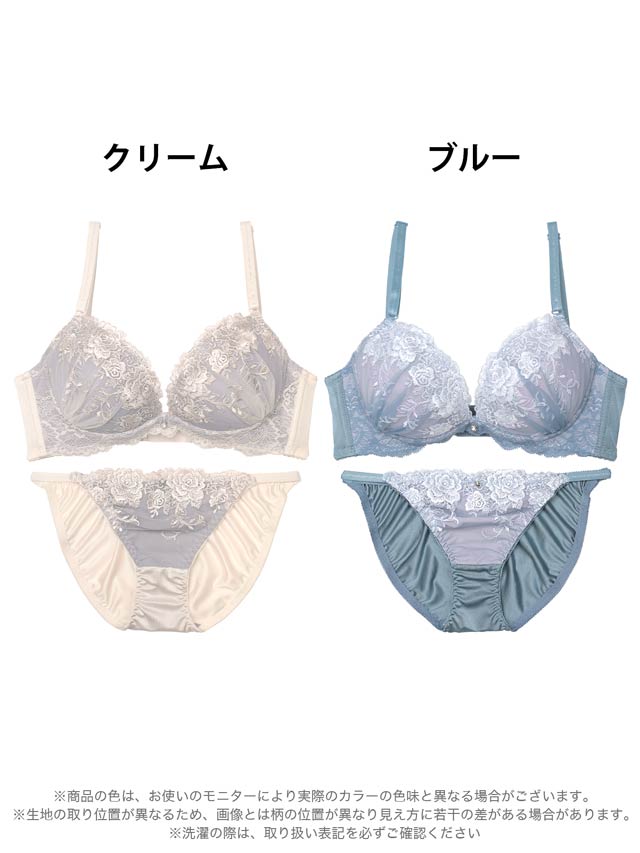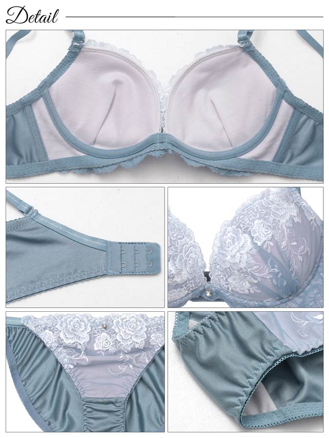 淡く儚げなローズ刺繍にダスティーブルーの透け感が美しいランジェリー。華奢なストリングデザインは腰回りから色気漂わせるアクセントに◎ 脇高構造でスッキリとしたシルエット、バストラインのキープを快適に保ちます◎