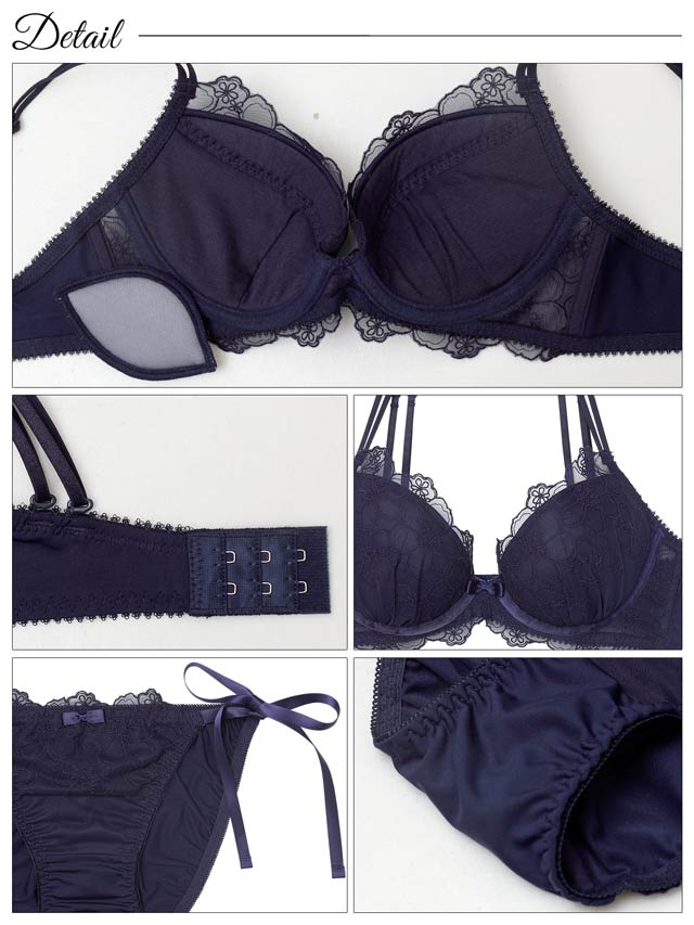 大人フェミニンな雰囲気を演出するフラワー刺繍をあしらったランジェリー。細めのダブルストラップは取り付け方次第で3通りのアレンジが可能で、魅力的な背中見せを演出します!ショーツサイドのリボンはほどけても安心な飾りリボン仕様です♪