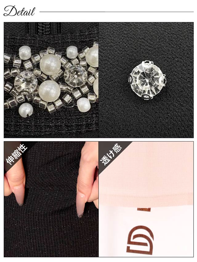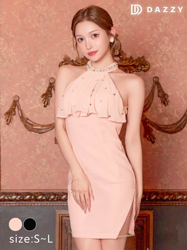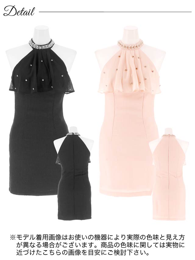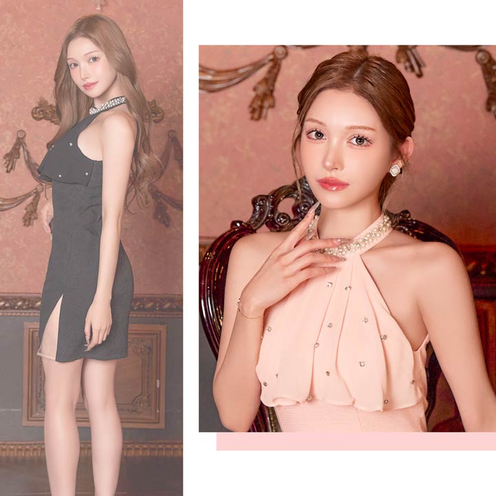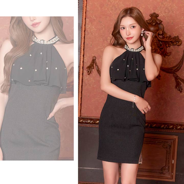煌びやかなラインストーンを散りばめたアメスリ仕様が大人セクシーなミニドレス。首元の細かいパールビジューがお顔周りからゴージャス感を与えてくれる高見え要素たっぷりな1着◎ シースルースリットの太腿見せも魅力的です♪