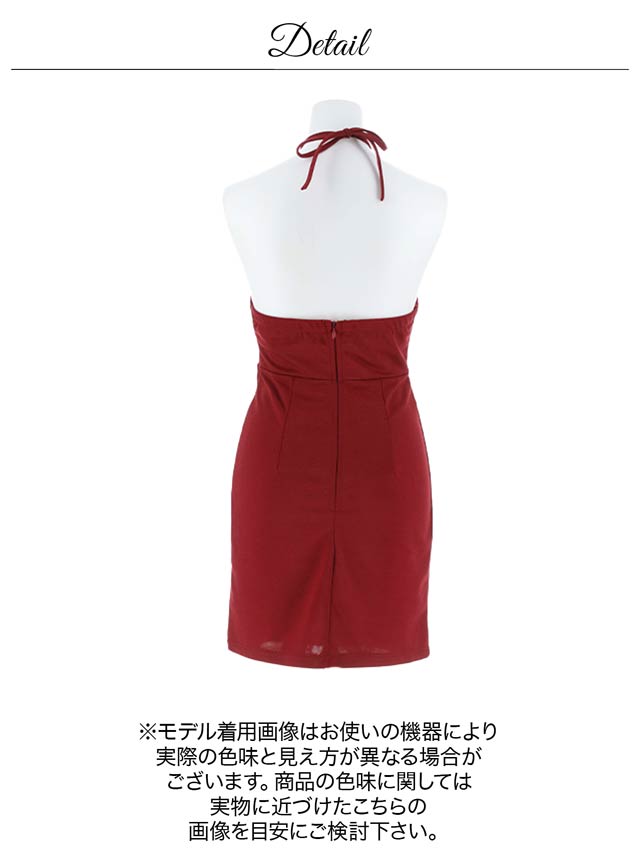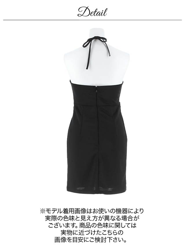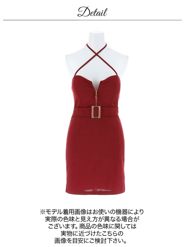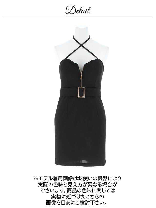>バストを強調するクロスホルターネック&フロントジップデザインがシンプルながらもセクシーさ抜群のミニドレス♪大きなバックルがアクセントになったハイウエストのベルトモチーフで脚長効果◎伸縮性のあるストレッチ生地で着心地も快適です。