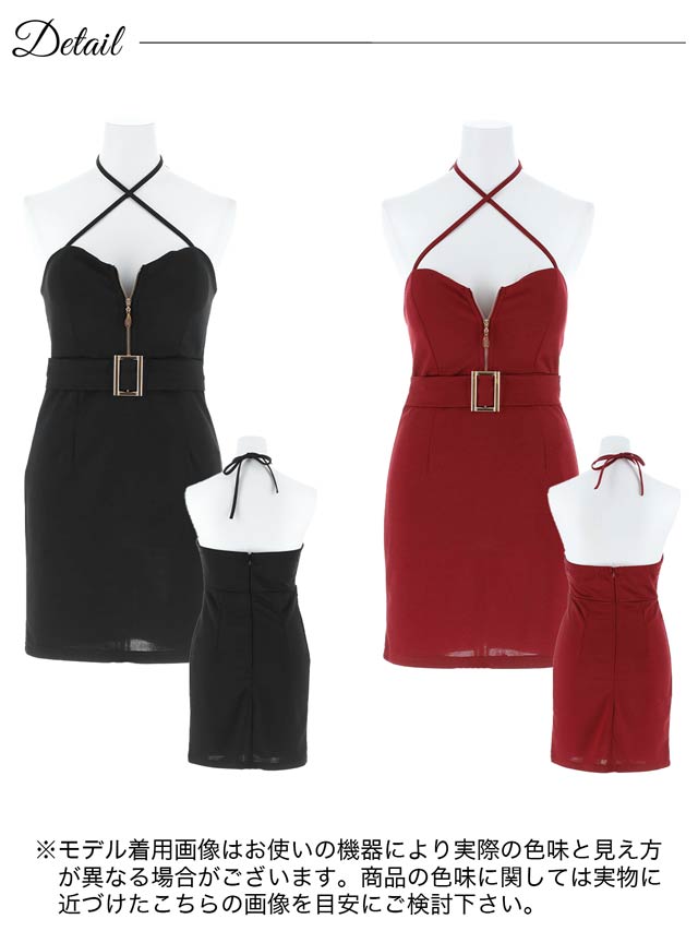 >バストを強調するクロスホルターネック&フロントジップデザインがシンプルながらもセクシーさ抜群のミニドレス♪大きなバックルがアクセントになったハイウエストのベルトモチーフで脚長効果◎伸縮性のあるストレッチ生地で着心地も快適です。