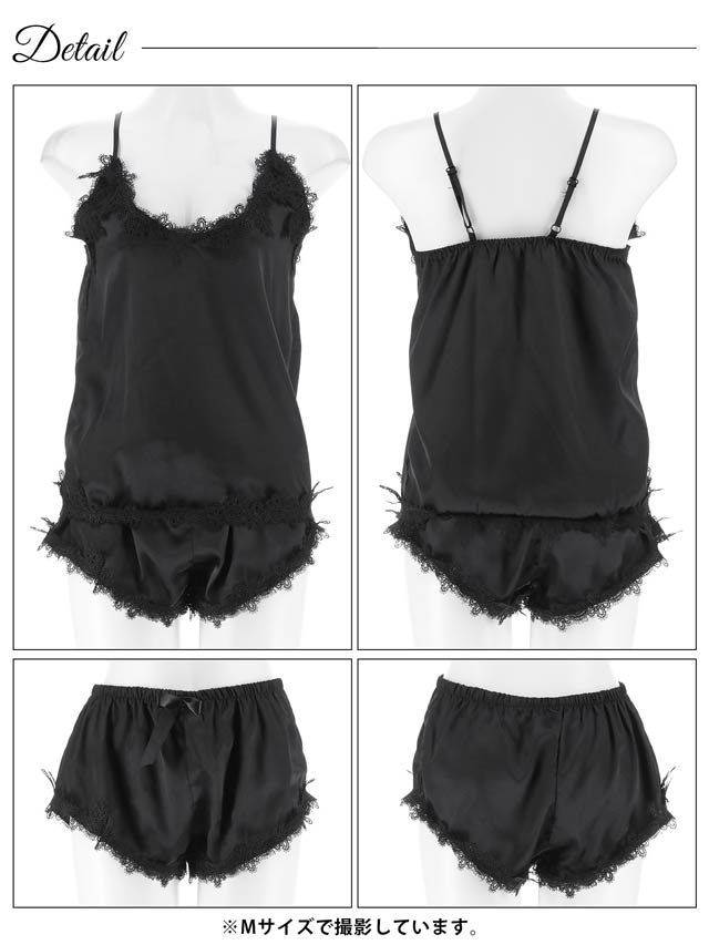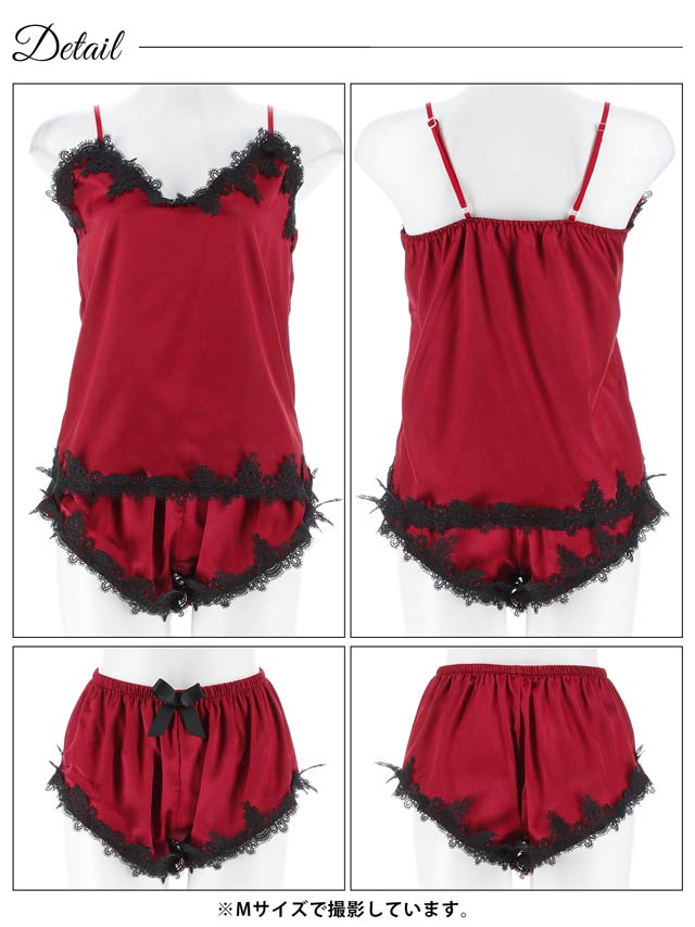 艶やかなサテンにブラックのケミカルレースをあしらった大人セクシーな雰囲気のキャミソール&タップパンツセット。パンツフロントの大きなリボンがほどよく甘さをプラスします◎さらっとした軽い着心地でリラックスタイムを快適に過ごせちゃう1着です♪