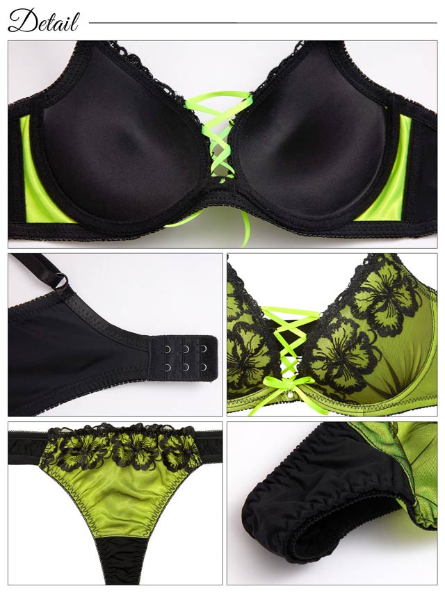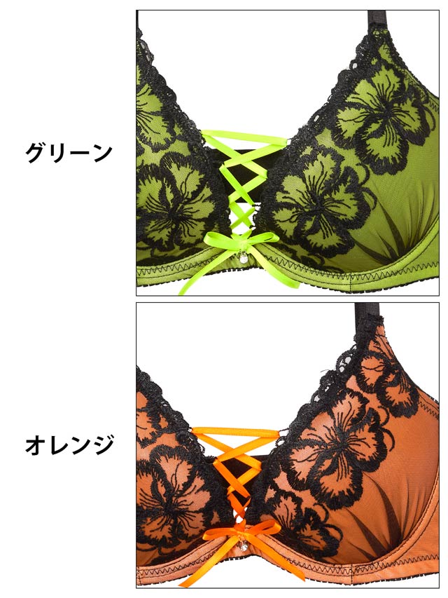鮮やかなネオンカラーにブラックのフラワー刺繍を重ねた、華やかで存在感のあるランジェリー。胸元のレースアップがバストラインをセクシーに引き立て、女性らしい魅力をプラス♪ショーツサイドはWストリングデザインで腰元を色っぽく華奢に見せてくれます。