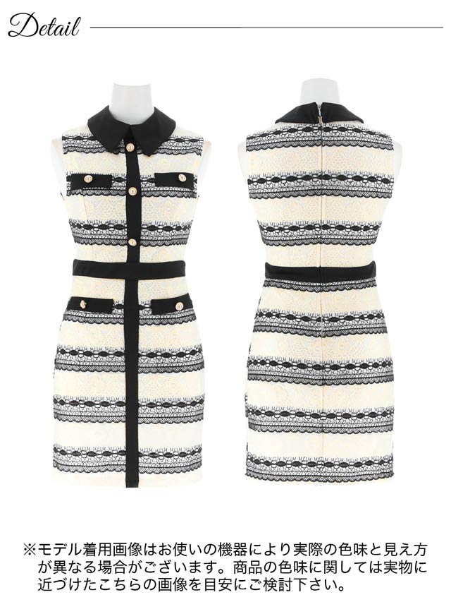 全面にあしらわれたレース素材のボーダー柄が印象的なミニドレス。上品な襟元とフロントラインがシルエットにメリハリを効かせてくれます◎ 谷間開きに抵抗がある方でも着やすく、しっかり大人かわいい雰囲気を演出します◎