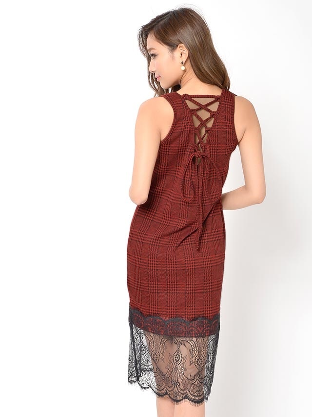 大人気のグレンチェック柄を使用したタイトドレス。丈も長めで裾にレースをあしらっているので上品さはバツグン♪背中も編み上げになっていて後姿は肌を見せる二面性が特徴です!ボレロやストールも合わせやすい一着です。