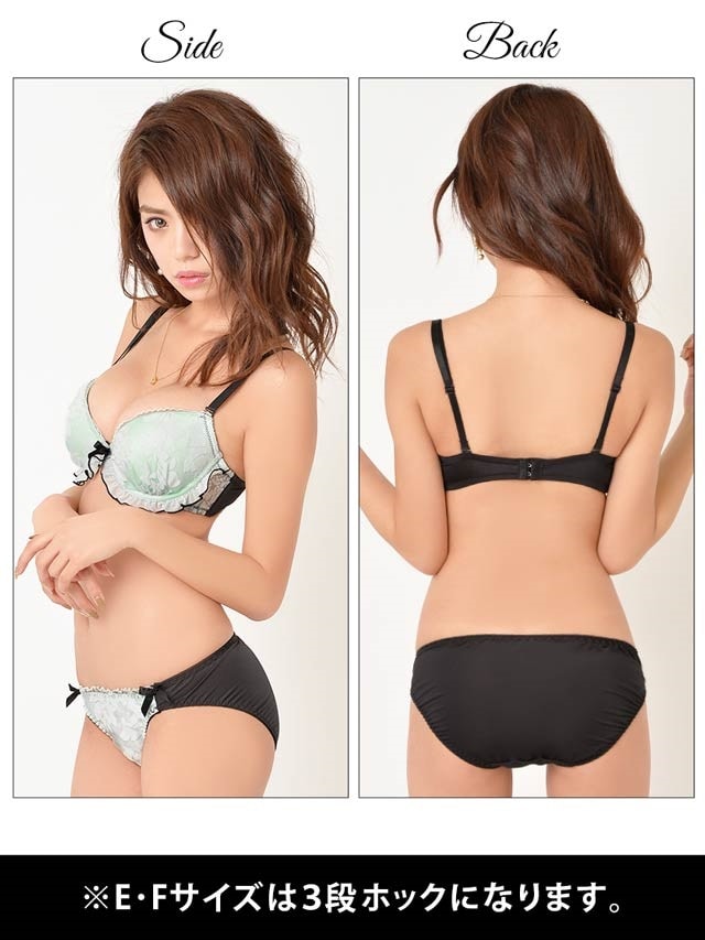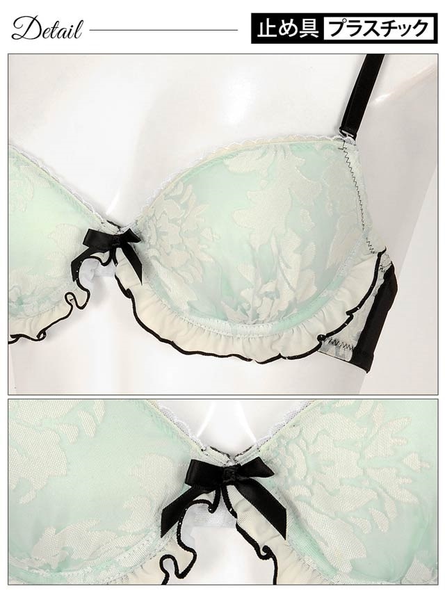 オーガンジー素材に花柄を描いた春らしいデザイン♪アンダー部分にあしらわれたフリルでSweetな雰囲気に。ショーツサイドにはプチリボンを飾りさらに甘さをプラス♪とことん甘い雰囲気になりたい女の子にオススメのブラセットです!
