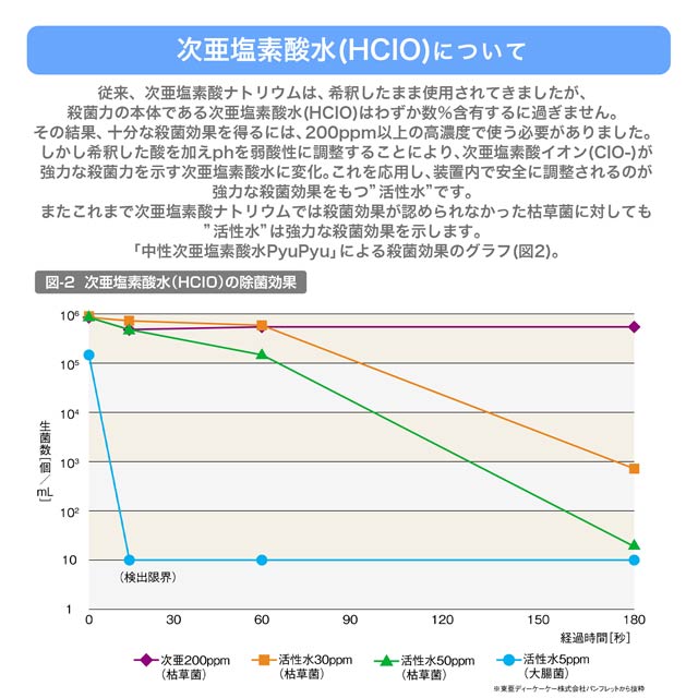 「中性次亜塩素酸水」中性であり刺激が少なく食品除菌などにも利用でき人にやさしいので安心です。除菌とともに消臭にも使用でき空間散布にも適している。また、殺菌力が強く大半のウィルスや細菌を除去する効果があることが確認されています。